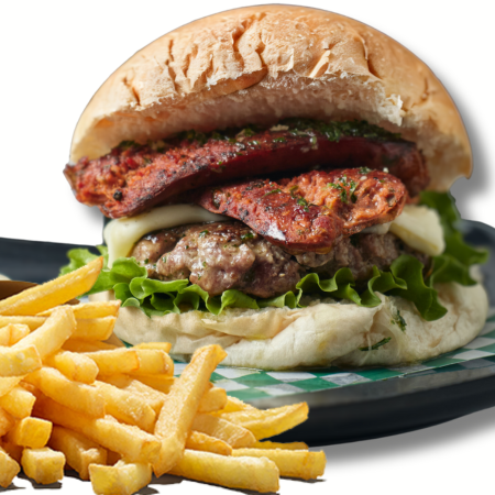 con carne tipo smash 100g, pan artesanal, queso mozzarella fundido, chorizo a la plancha con auténtico chimichurri argentino, tomates frescos, pepinillos agridulces, lechuga crujiente y cebollas caramelizadas. Acompañada de papas fritas doraditas. ¡Un sabor único con todo el poder del chorizo y la carne smash!