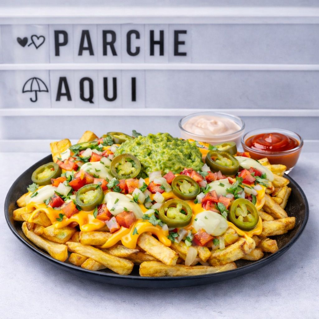 Papas Mexicanas 🇲🇽🍟 Papas fritas doraditas con queso cheddar fundido, pico de gallo fresco (tomate, cebolla y cilantro), cremoso guacamole, jalapeños picantes y un toque de salsa de ajo de la casa. ¡Explosión de sabor en cada bocado!