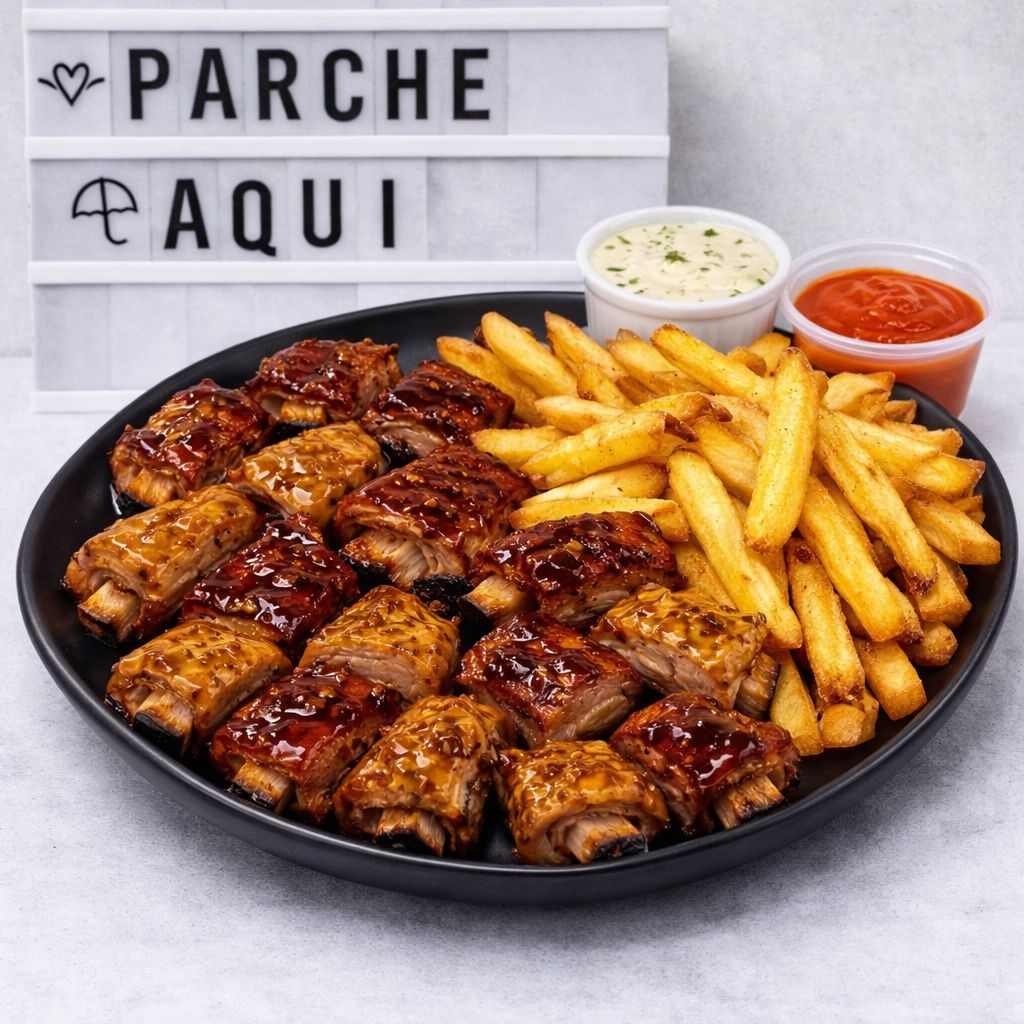 10 trozos de costillitas bañadas en salsa artesanal + papas francesa