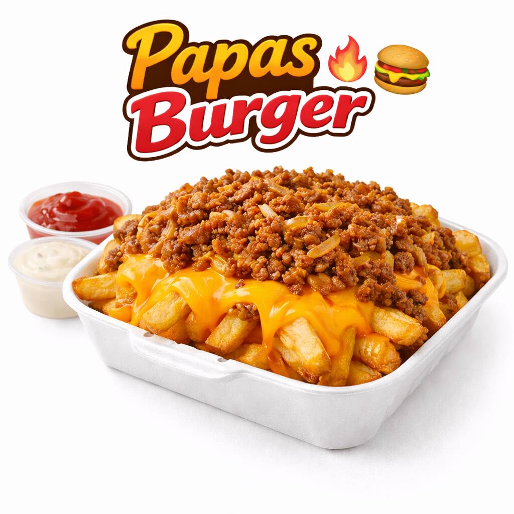 Papas Burger 🔥🍔 Papas fritas crocantes bañadas en queso cheddar,acompañadas de jugosa carne de hamburguesa a la plancha y cebollas caramelizadas . ¡Un antojo poderoso para los amantes de la burger!
