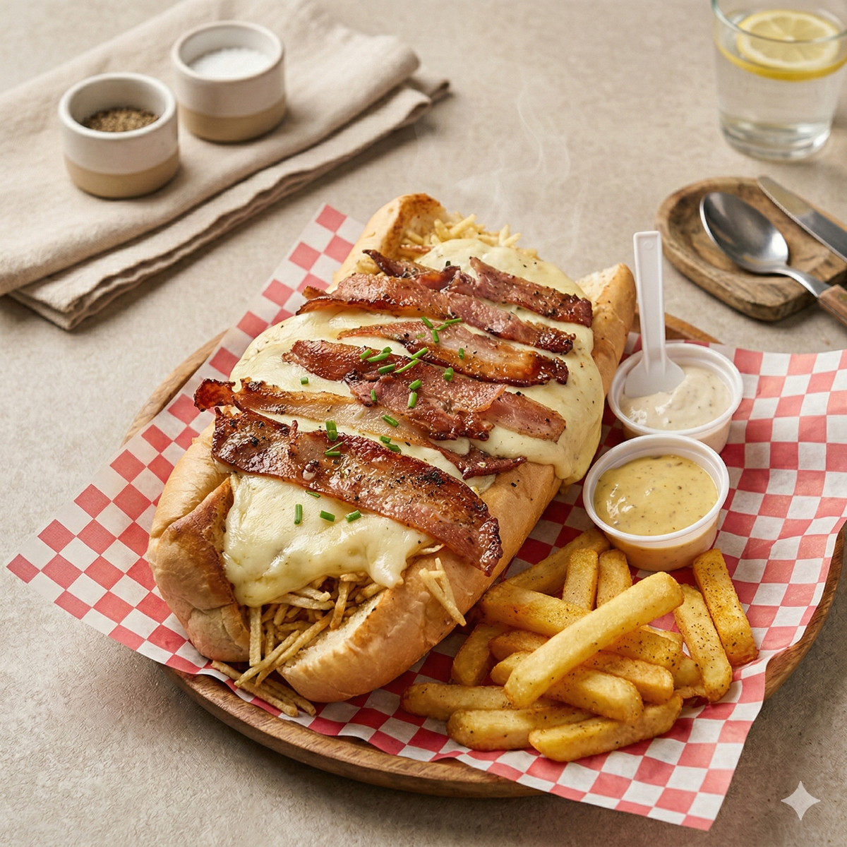 Carne de Hamburguesa con Filete de Pollo, Queso tocineta, lechuga, ripio de papas, Ensalada de lechuga y máximo 4 salsas, roja, rosada, mostaza, BBQ, Showy, maíz. PAPAS A LA FRANCESA