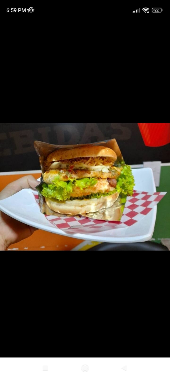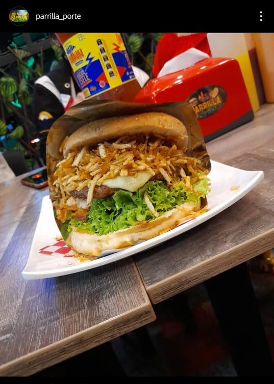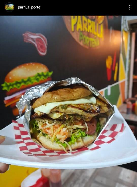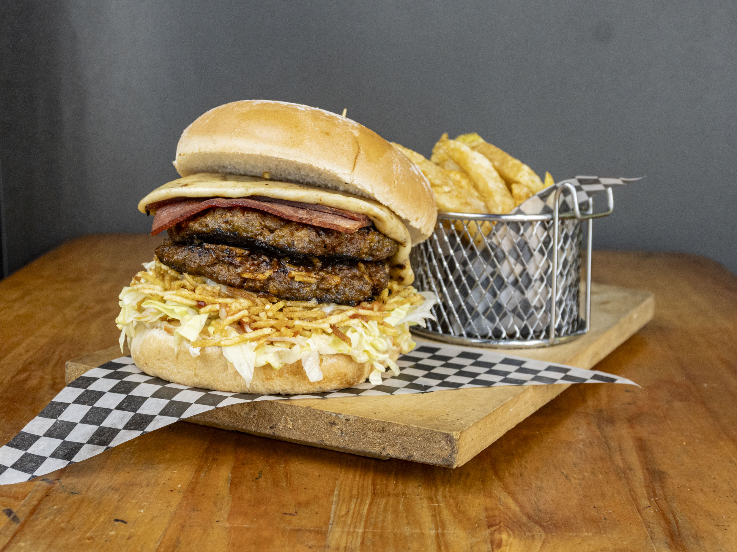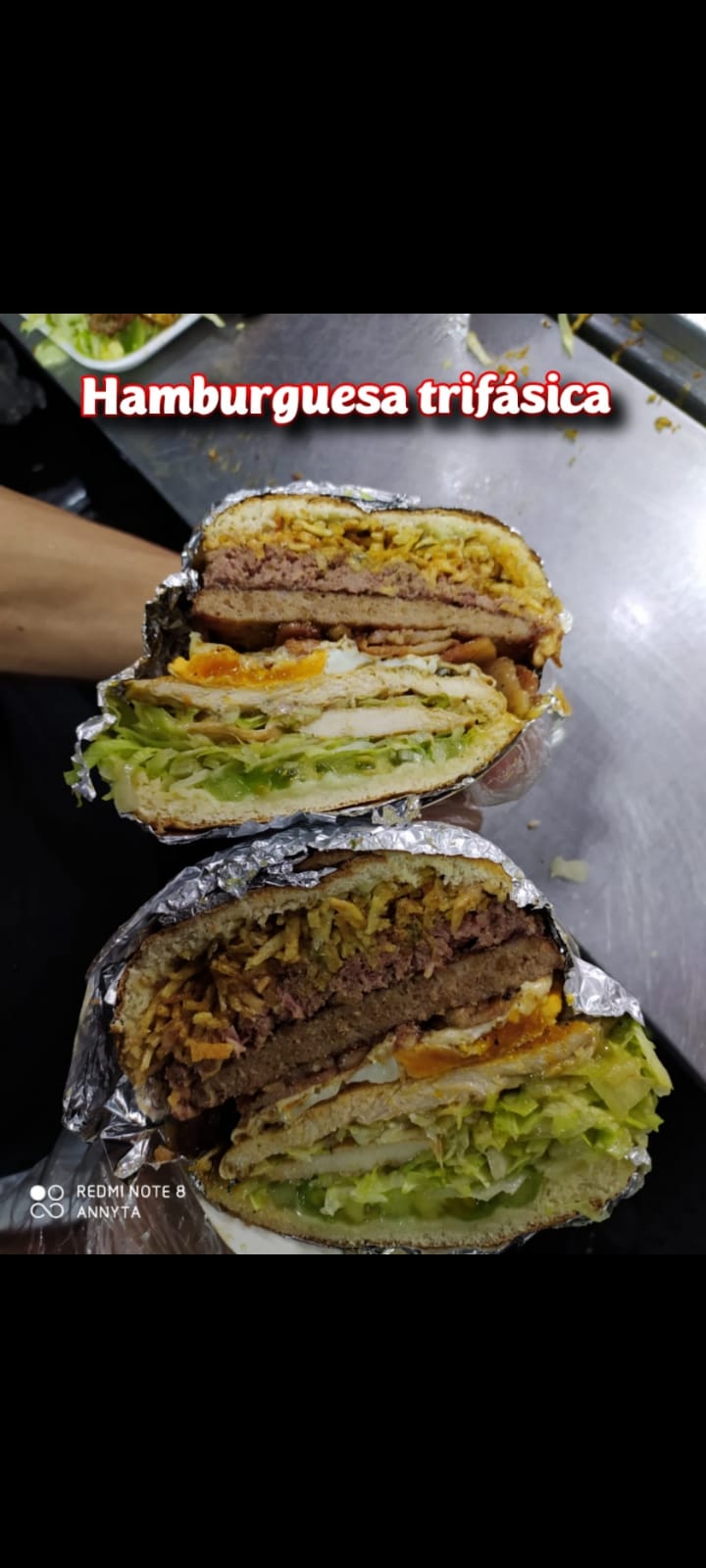 Pan artesanal, 2 Carnes de Hamburguesa 80 gramos por cada 1, queso mozzarella, tocineta, lechuga, ripio de papas, Ensalada de lechuga y máximo 4 salsas, roja, rosada, mostaza, BBQ, Showy, maíz(Extra de papa .aprox. 80-100 gr )