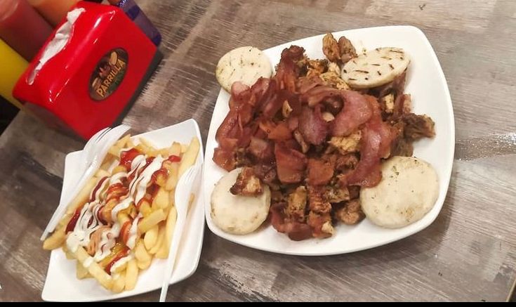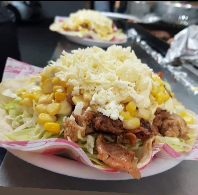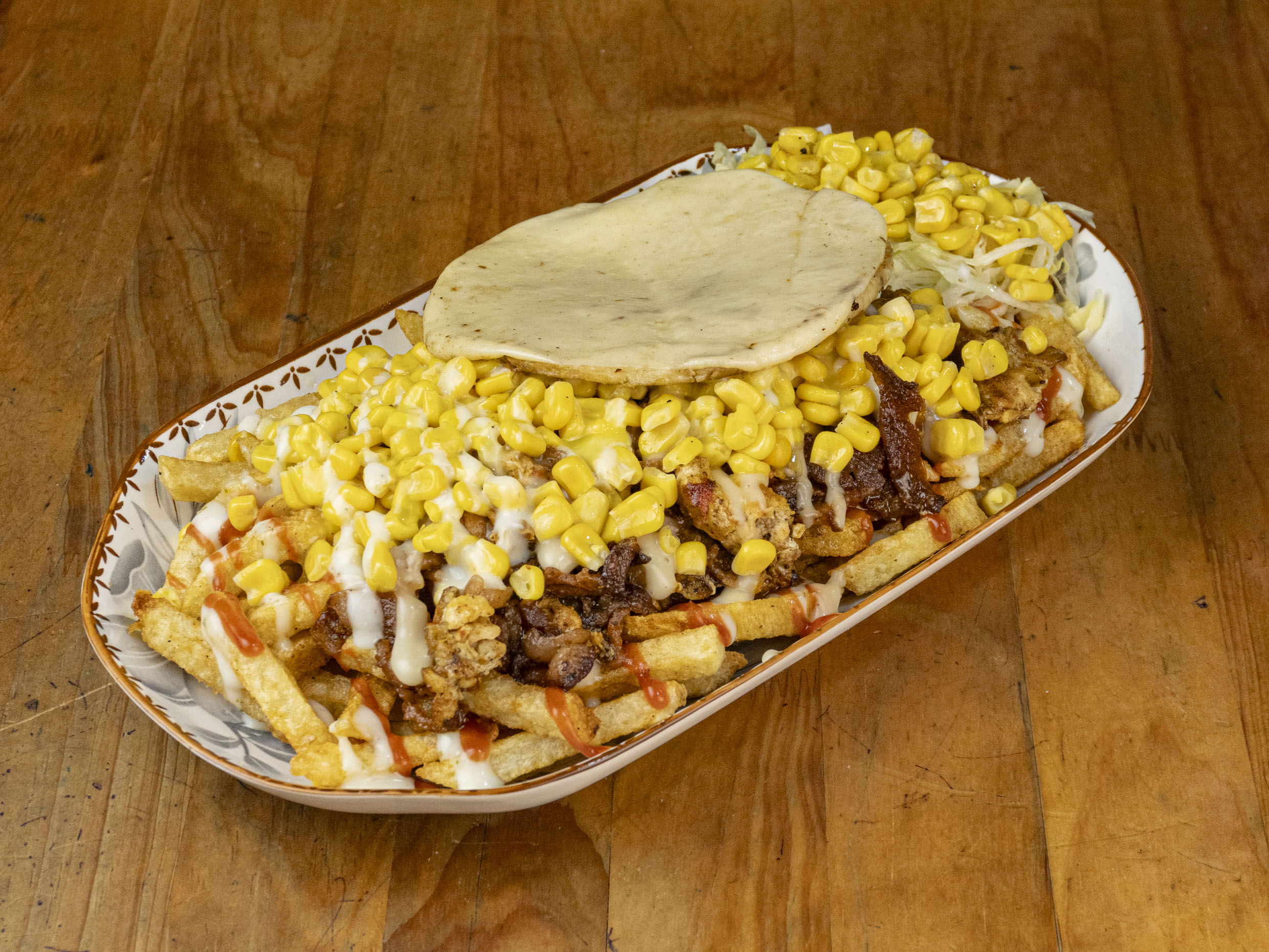 Papas a la francesa con salchicha ranchera, pollo, tocineta, maíz tierno, ensalada, ripio, lechuga, queso costeño y salsas de la casa.