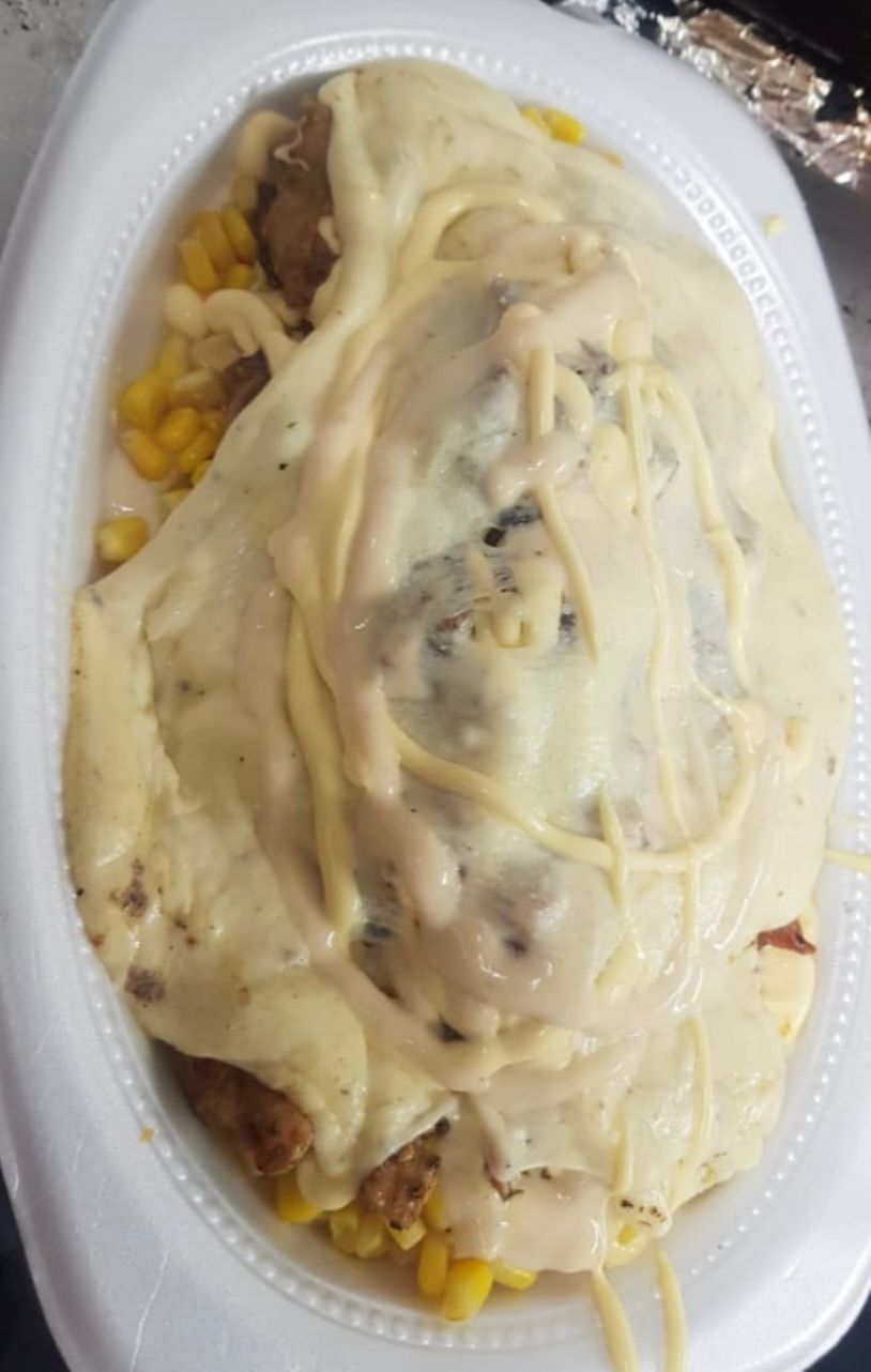 200grs POLLO MAIZ AREPA CON QUESO TOCINETA PAPAS A LA FRANCESA