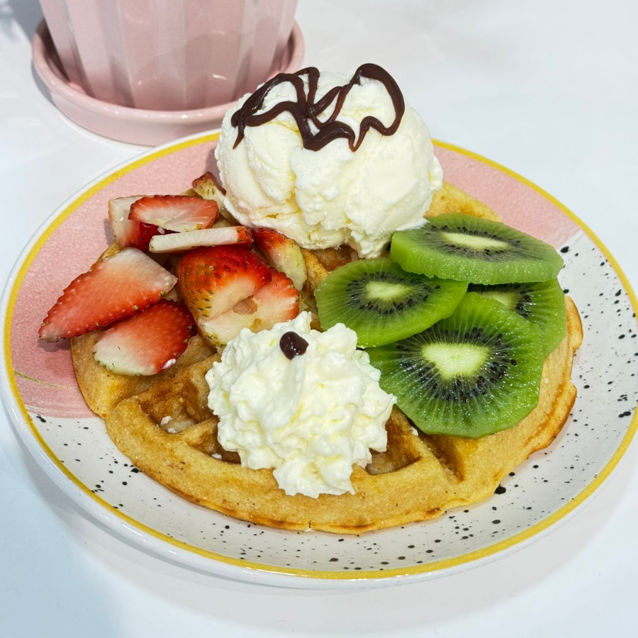 Waffle dulce acompañado de frutas (fresas o fresas y kiwi), helado y topping a tu elección y crema chantilly, ¡el postre perfecto!
