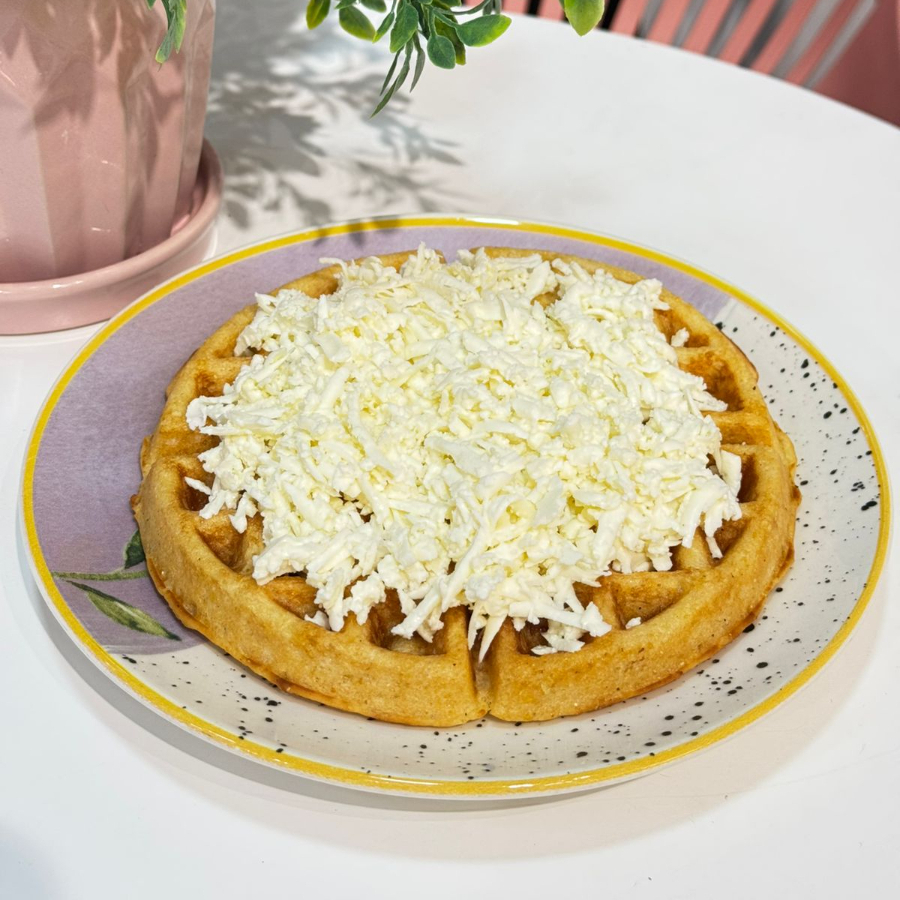 Waffle a base de chocolo (maíz tierno), acompañado de queso doble crema, arequipe, bocadillo y guayaba, ¡una delicia salada y dulce!