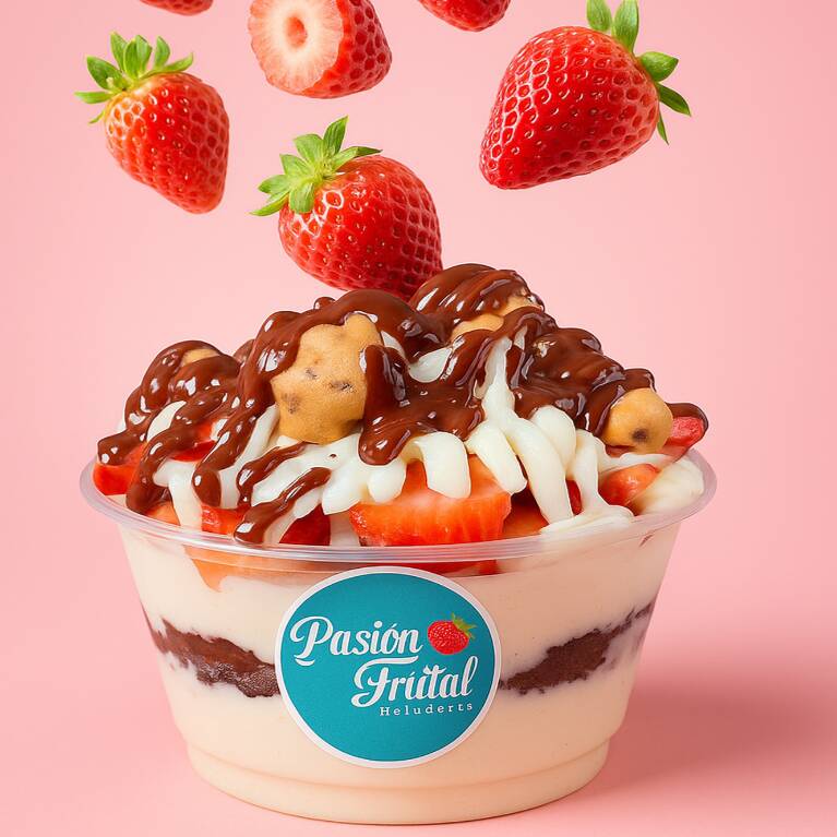 Fresas con crema de la casa, un topping clásico, 1 topping premium, Salsa de tu elección. 12oz.