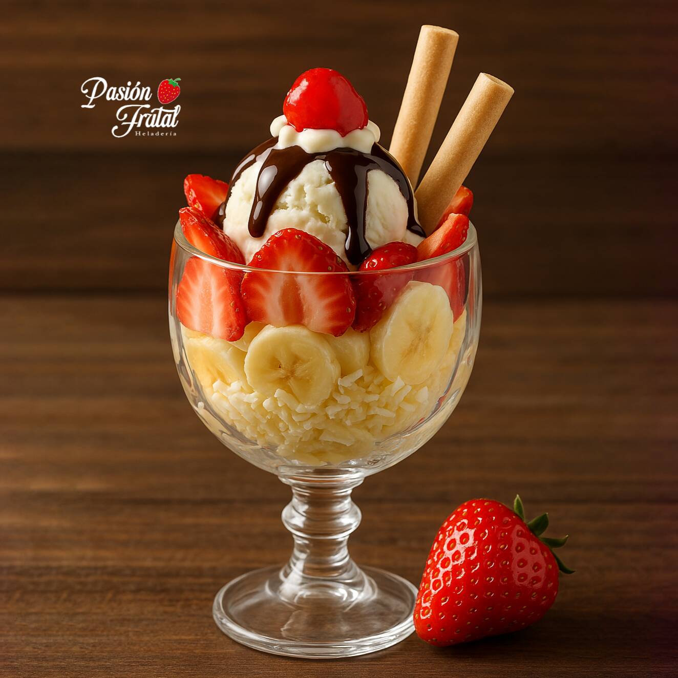 2 Bolas De helado, Trozos de Mango, Maracuyá en Almíbar, Salsa de la casa, Chantilly, Barquillos.