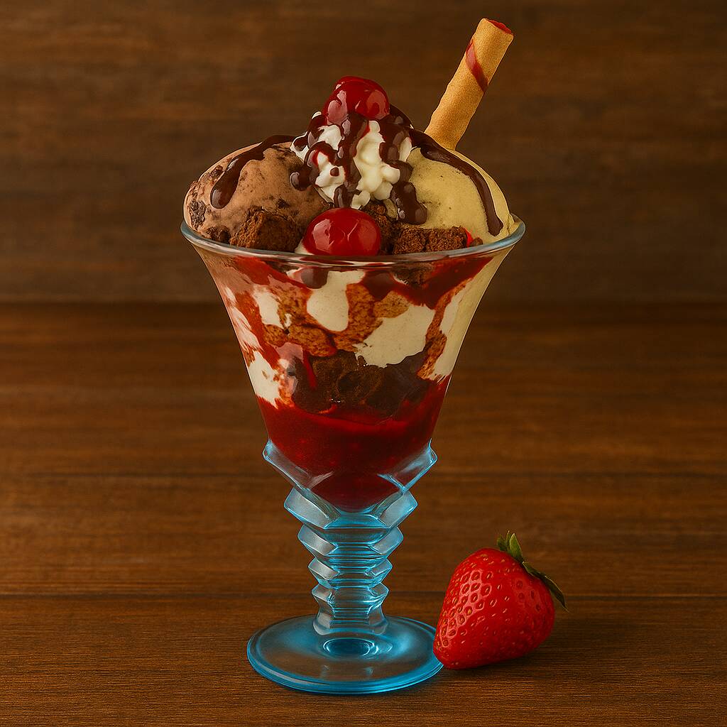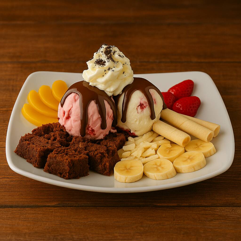 2 bolas de helado bañadas en cobertura de chocolate, acompañado de trozos de brownie, cerezas, chips de chocolate, salsa de frutos rojos, crema de chocolate, chantilly, piazza.