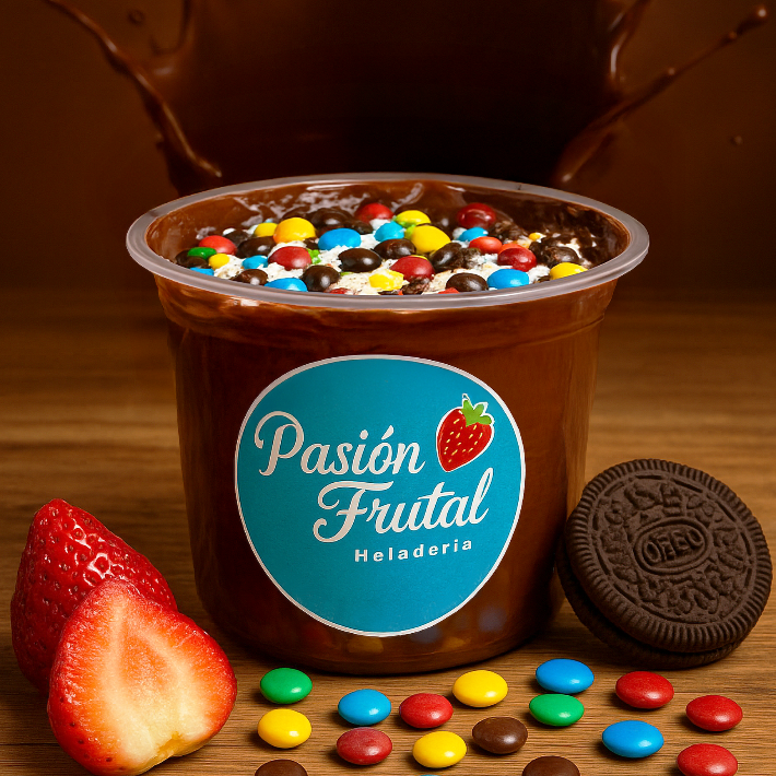 1 sabor de helado, crema de la casa, fresas, borde de chocolate, leche en polvo, m&m y galleta oreo.