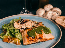 Mix de lechugas, cascos de tomate asado, champiñones, pasta corta en salsa pesto, salmón a la parrilla y queso parmesano.