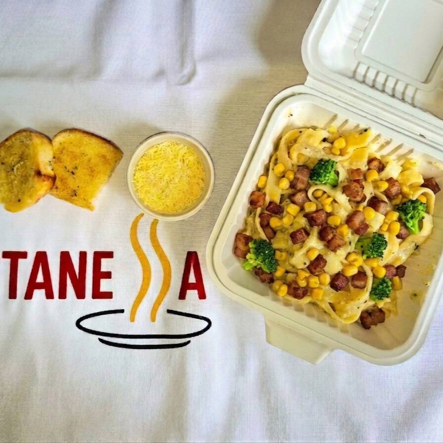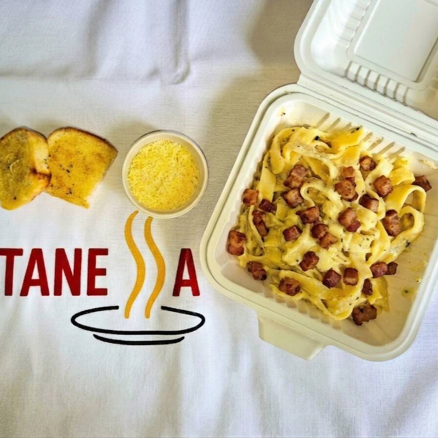 Pasta corta o larga en salsa carbonara queso parmesano + pan de ajo + bebida.