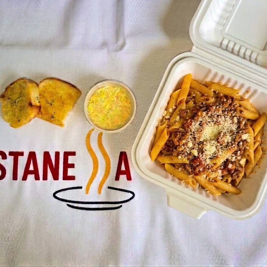 Pasta corta o larga en salasa boloñesa + porción pan de ajo + bebida a eleccion.