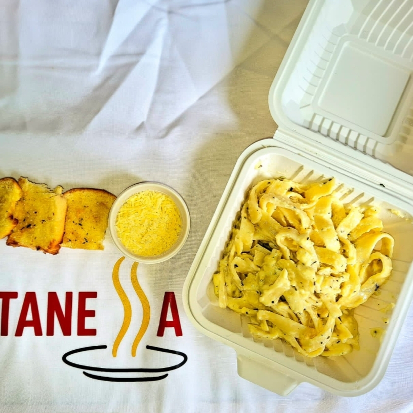pasta corta o larga en salsa afredo, queso parmesano, porción pan de ajo y bebida a elección.