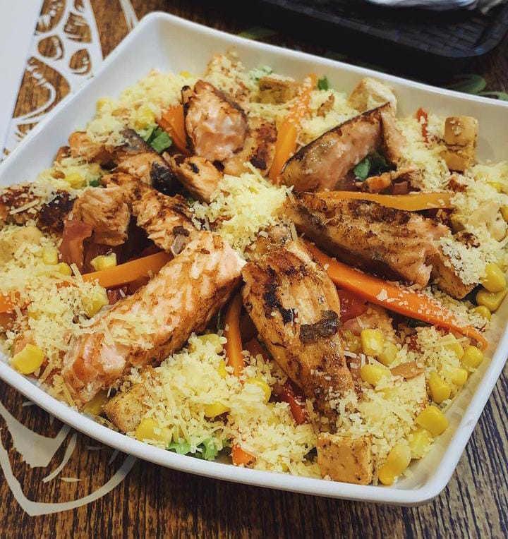 Lechuga, tomate, maicito, queso parmesano y salmón.