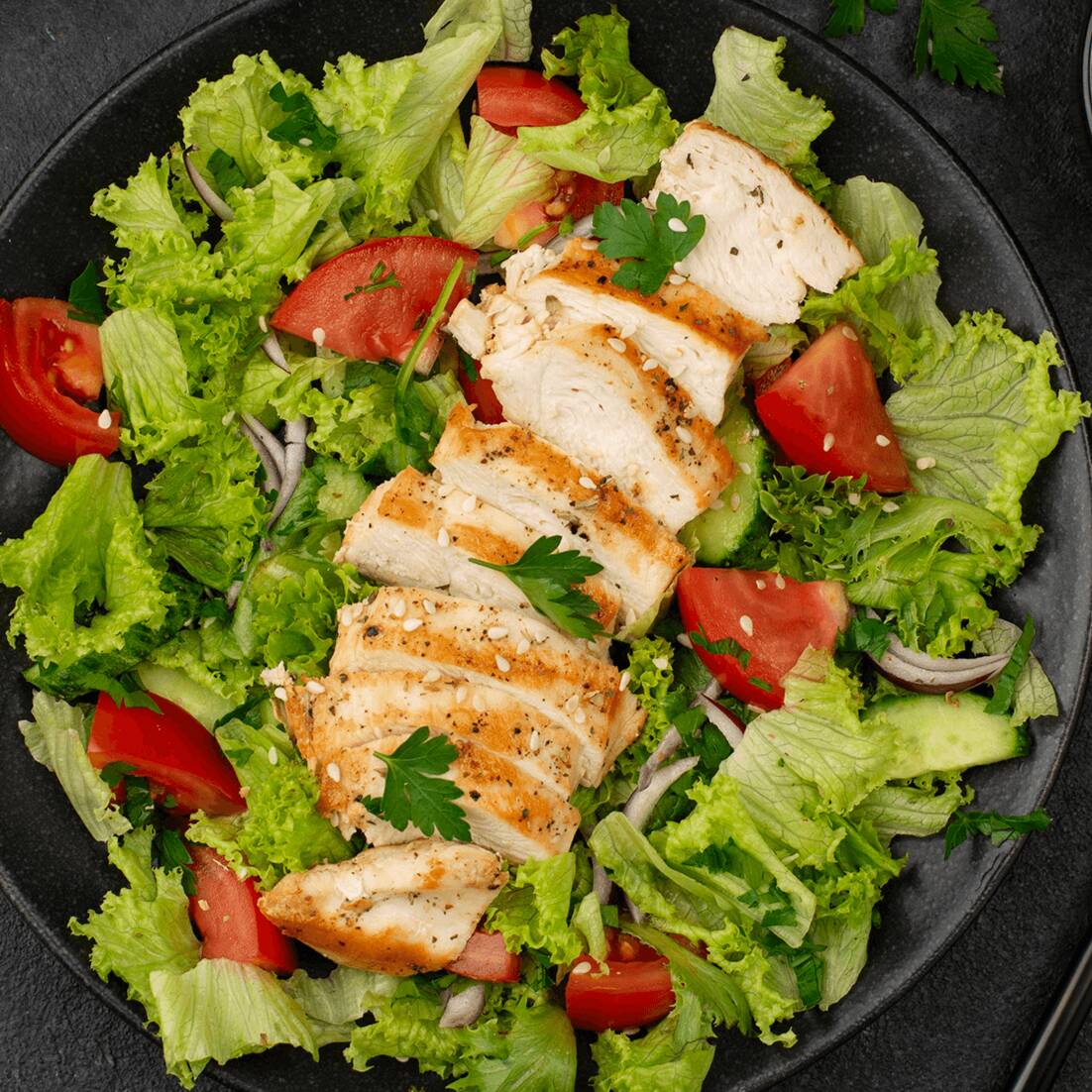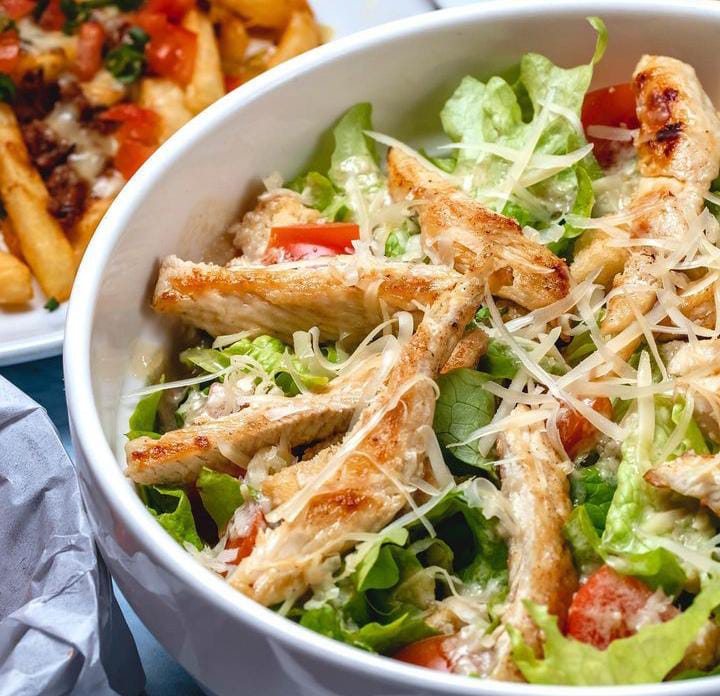 Lechuga, tomate, maicito, queso parmesano y pechuga.