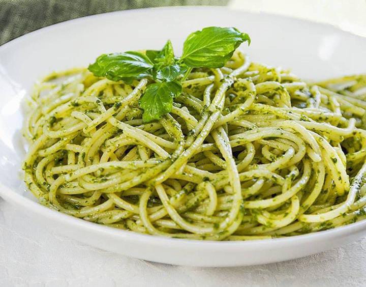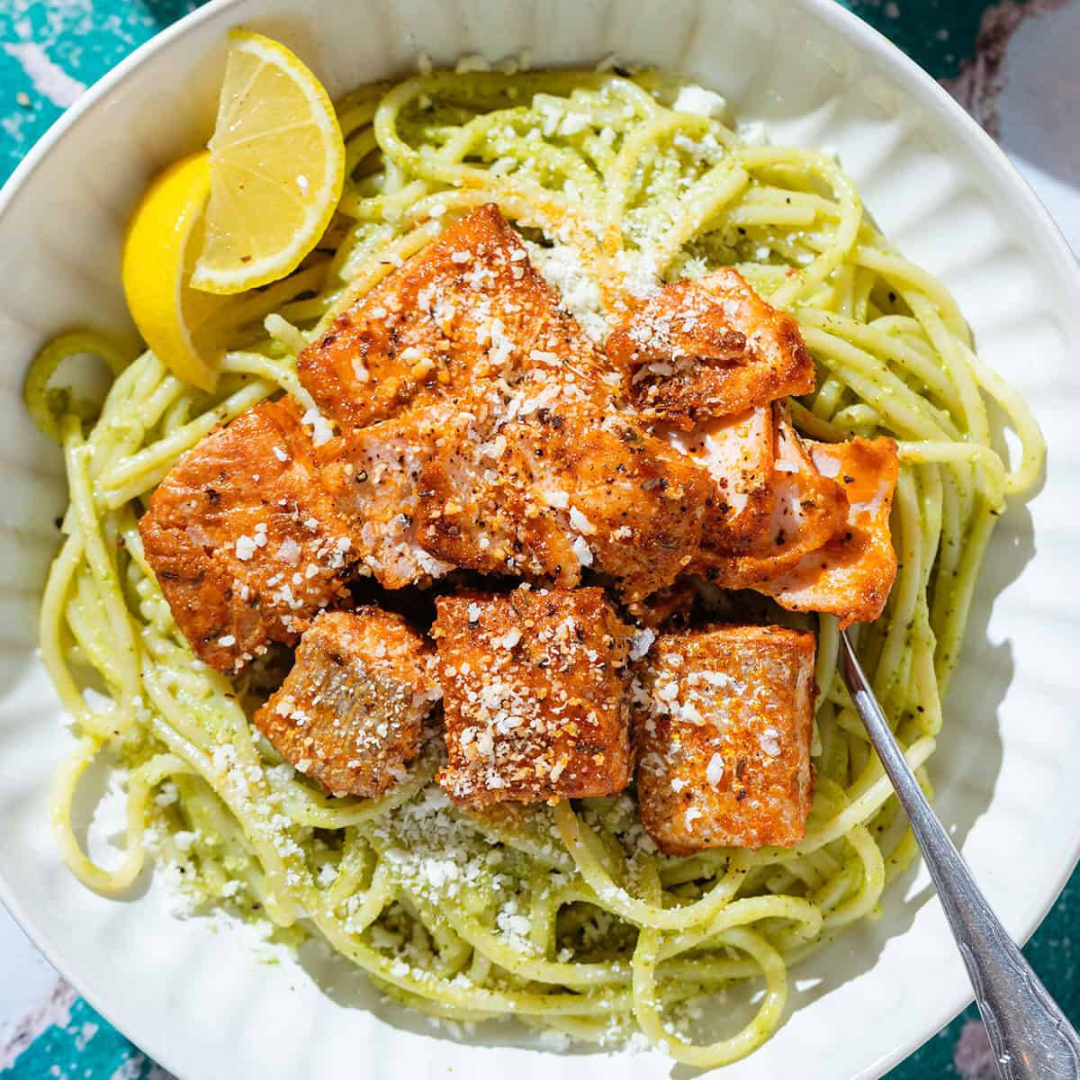 Pasta en salsa a base de albahaca y aceite de oliva con trozos de salmón.