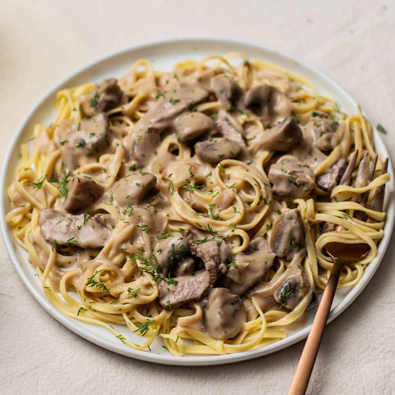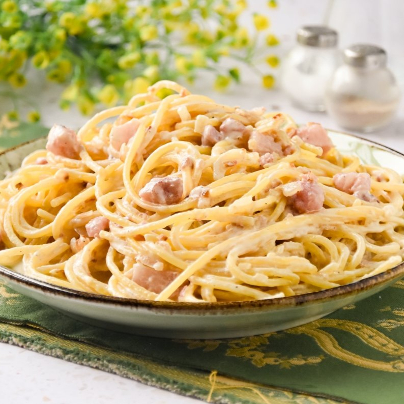Pasta bañada en salsa alfredo cremosa con tocineta.