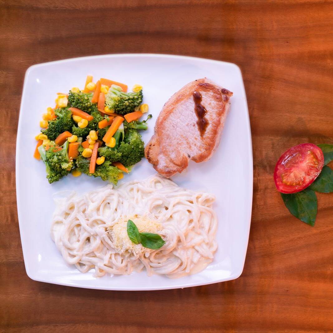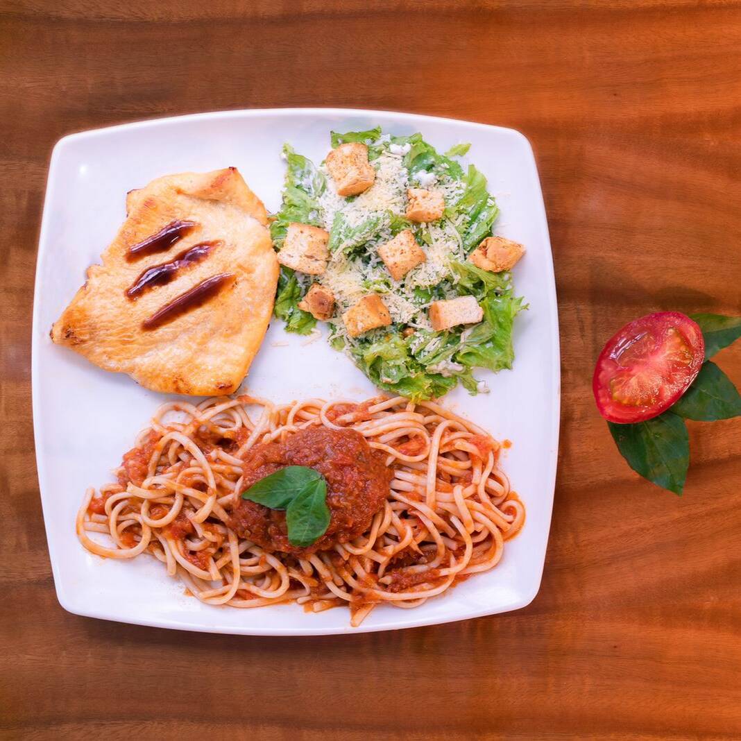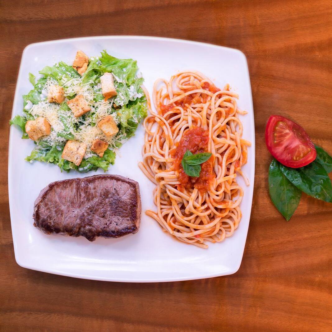 Incluye Pastas ó Papa (porcion personal) + Salsa ( 1 salsa a elegir ) + Ensalada ( 1 a elegir ) + Proteína a eleccion (200 gramos)
