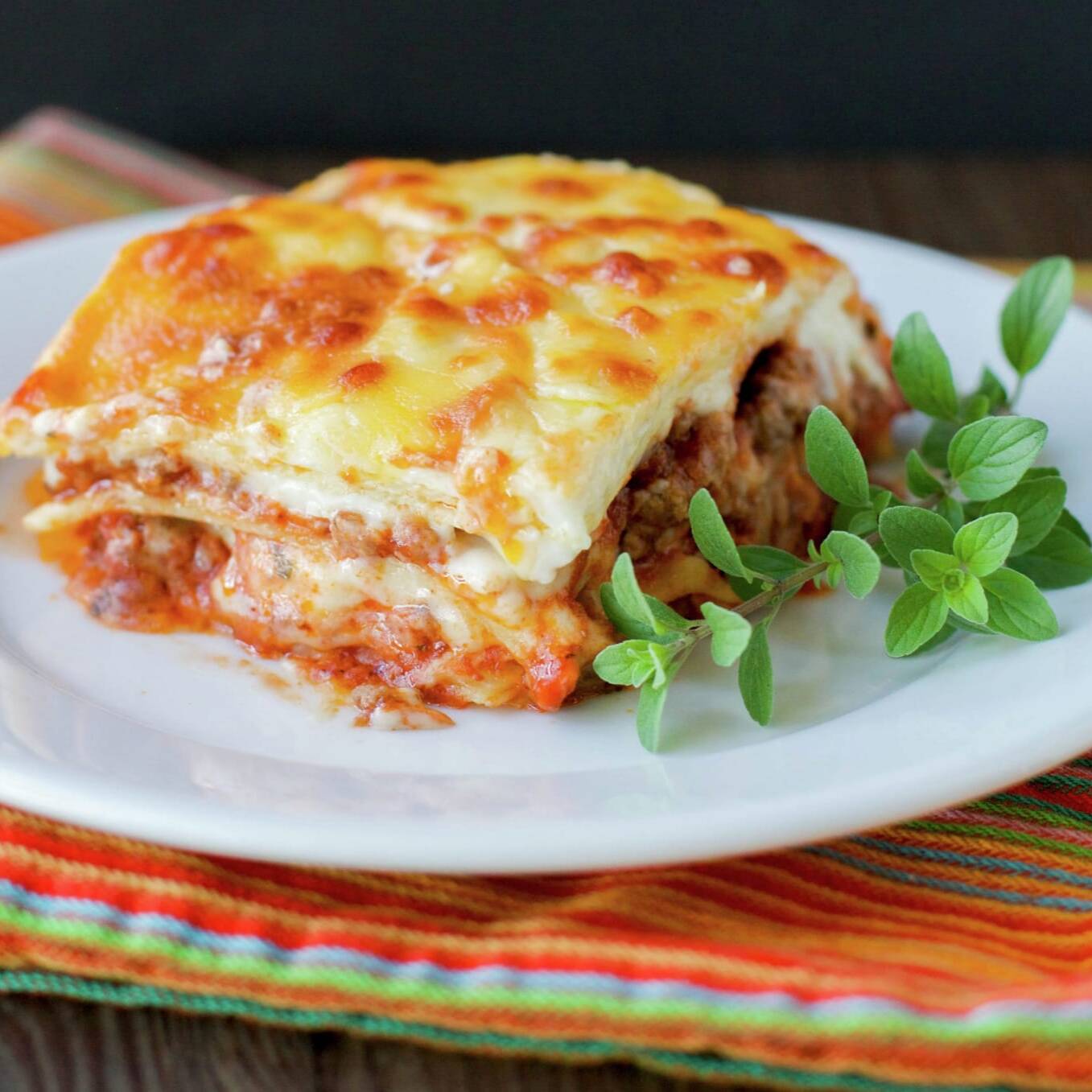 Lasagna de carne con salsa napolitana y queso mozzarella.