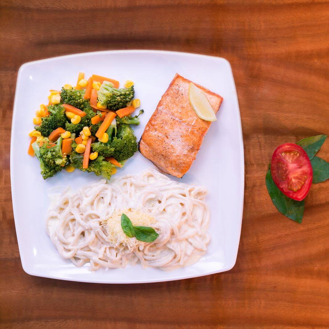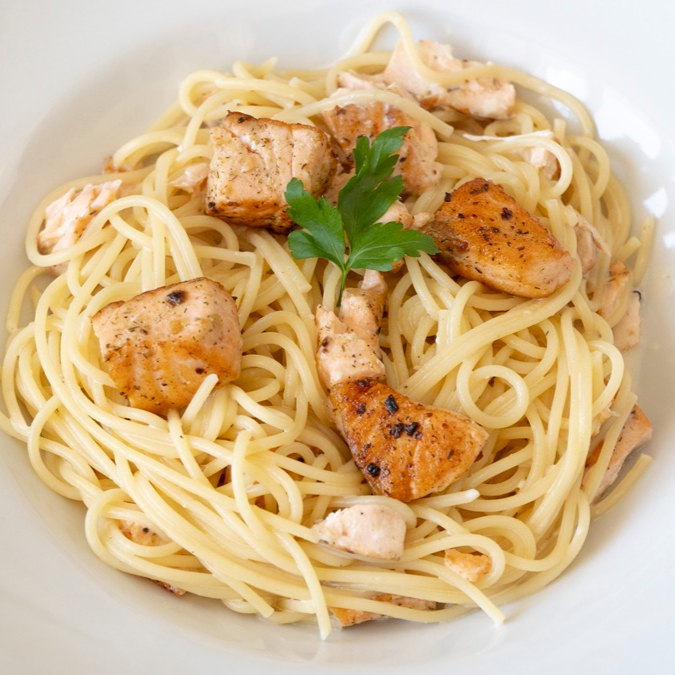 Pasta en salsa alfredo, acompañada de salmón y trozos de tocineta.