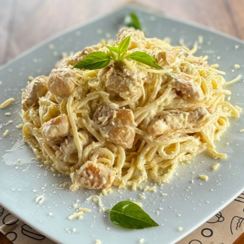Salsa alfredo con trozos de pollo y queso parmesano.