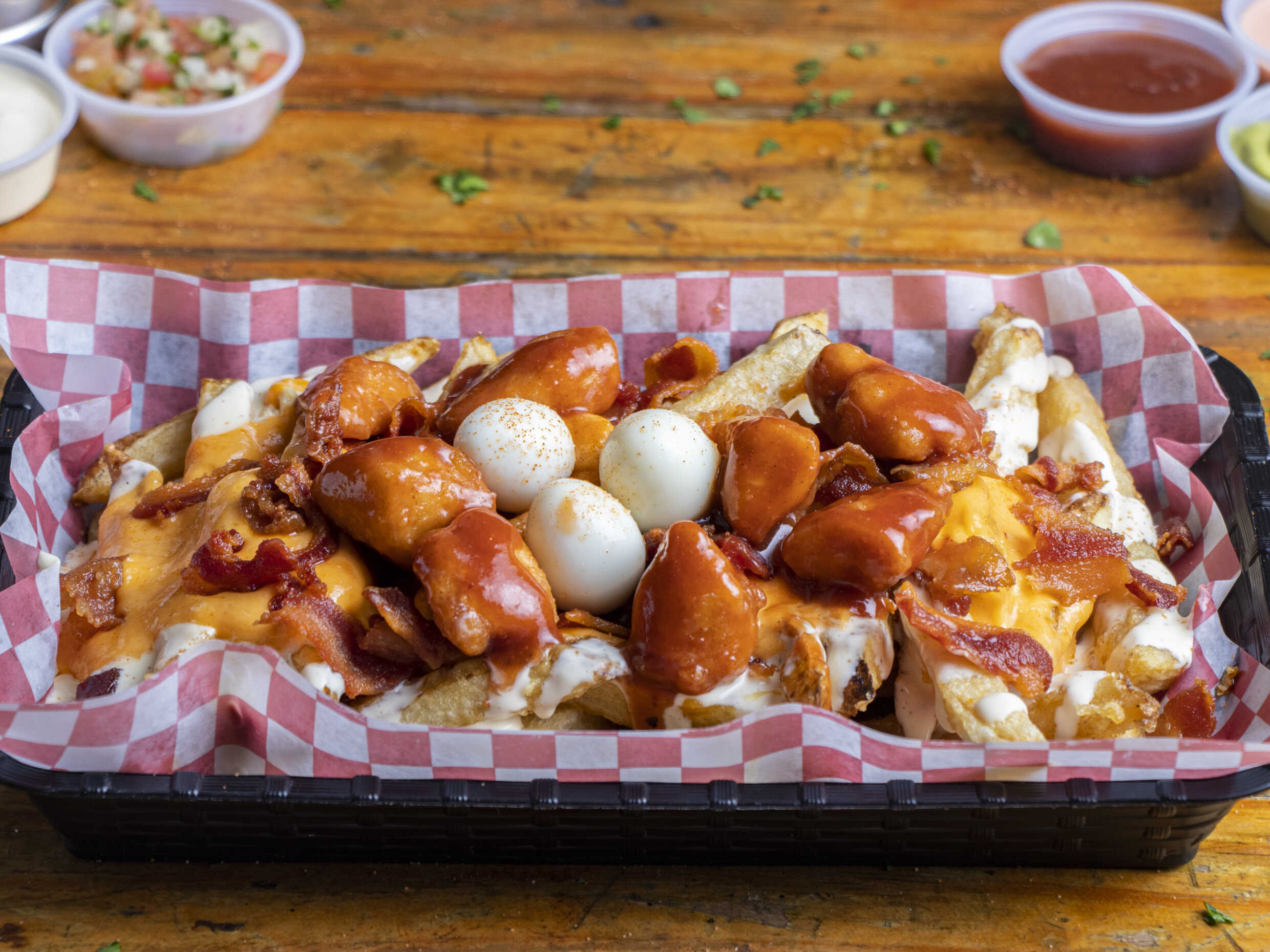 270 gramos de chimba de papas crujientes con queso mozzarella, salsa de la casa, crispetas de pollo bañadas en BBQ Jack Daniel's, tocineta, salsa cheddar, sour cream y huevitos.