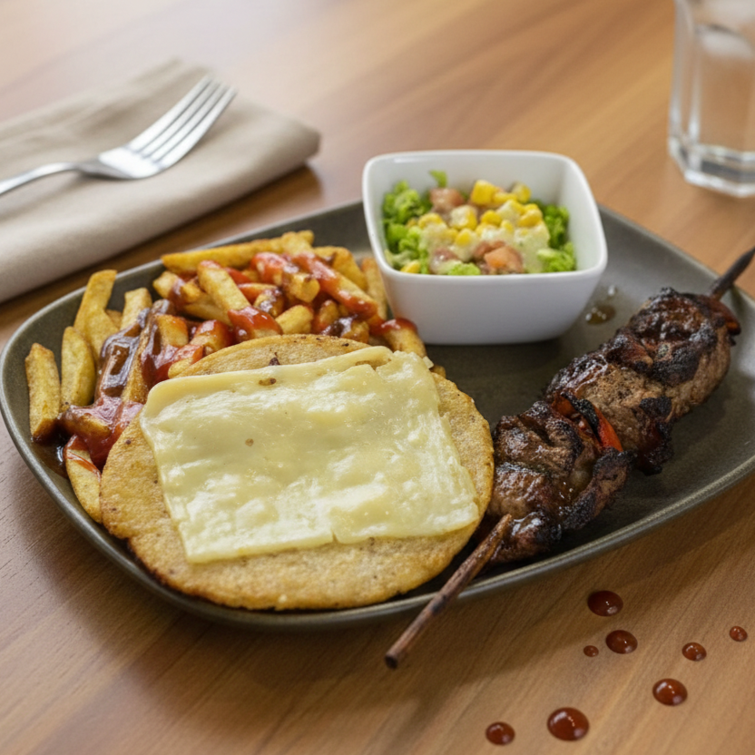 Chuzo de pollo, acompañado de patatas fritas al estilo belga, ensalada, arepa con queso y salsas de la casa al gusto.