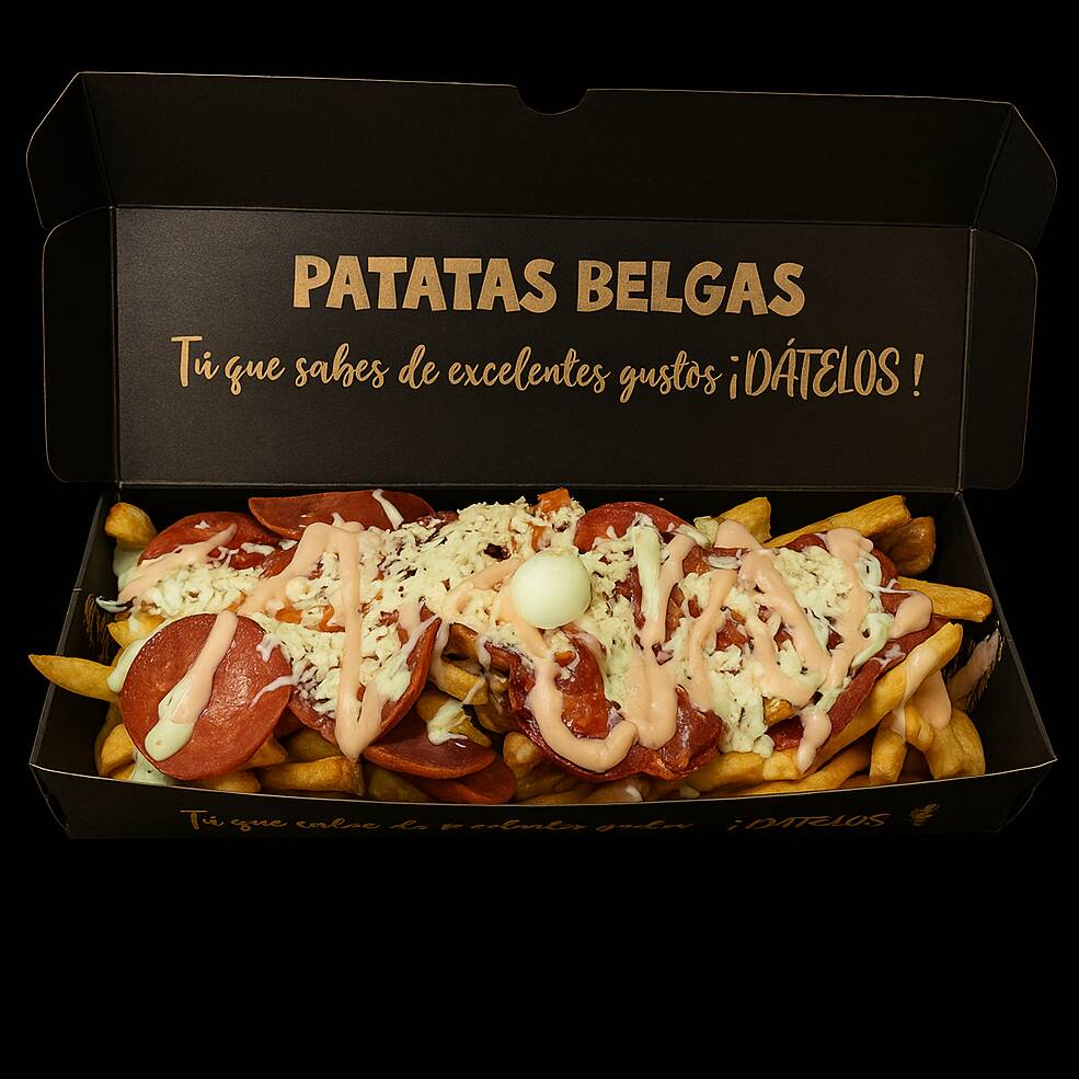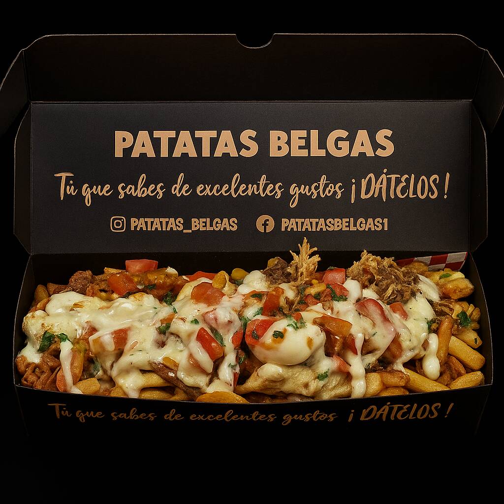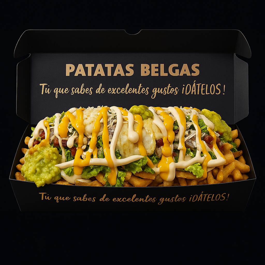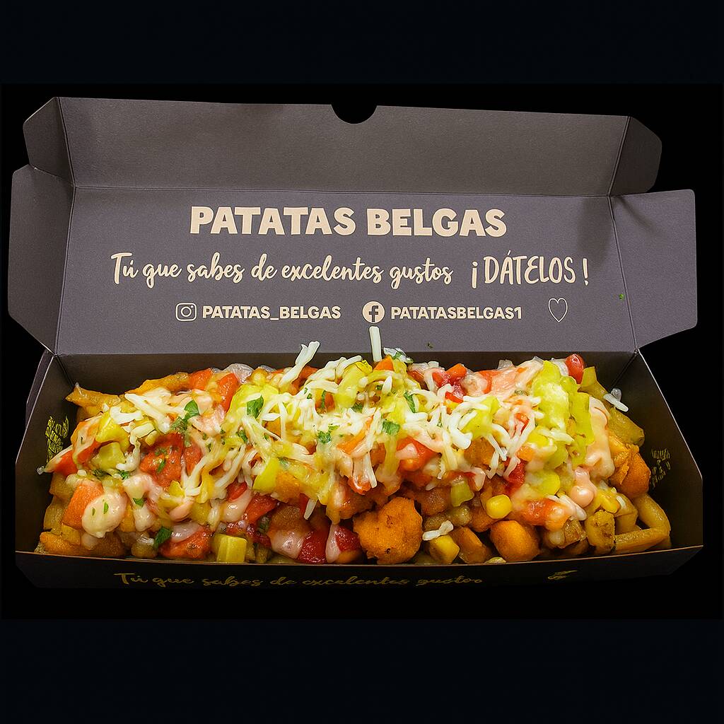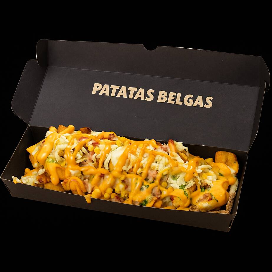 Patatas fritas al estilo belga, queso, huevos de codorniz, chicharrón, guacamole, maduro en trozos, chorizo, tocineta, maíz tierno y cheddar.