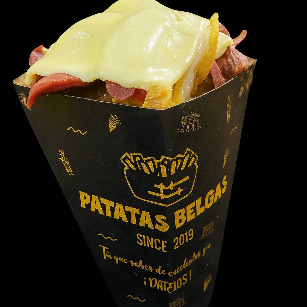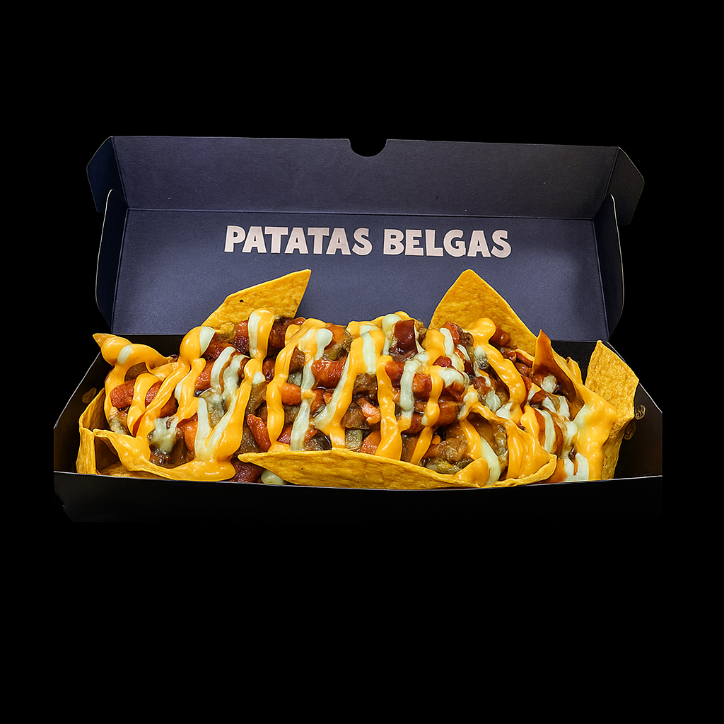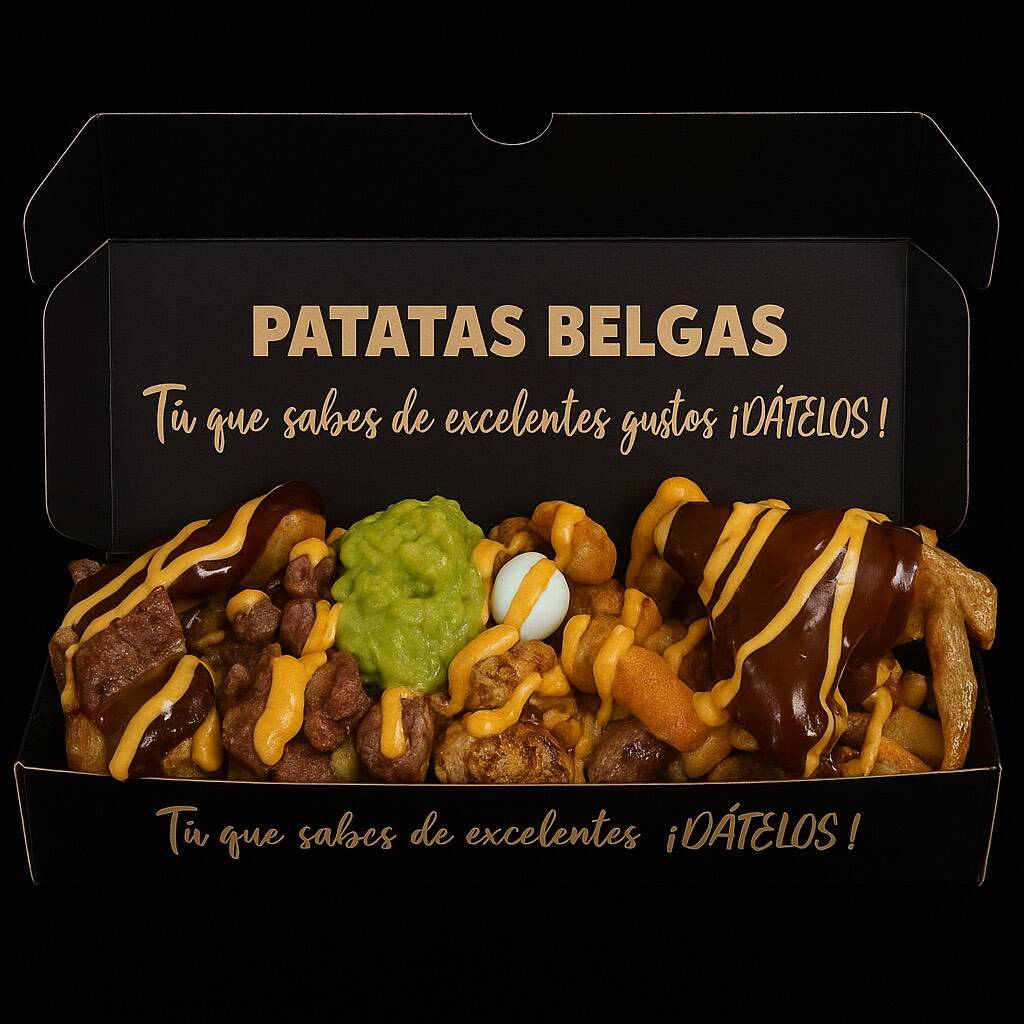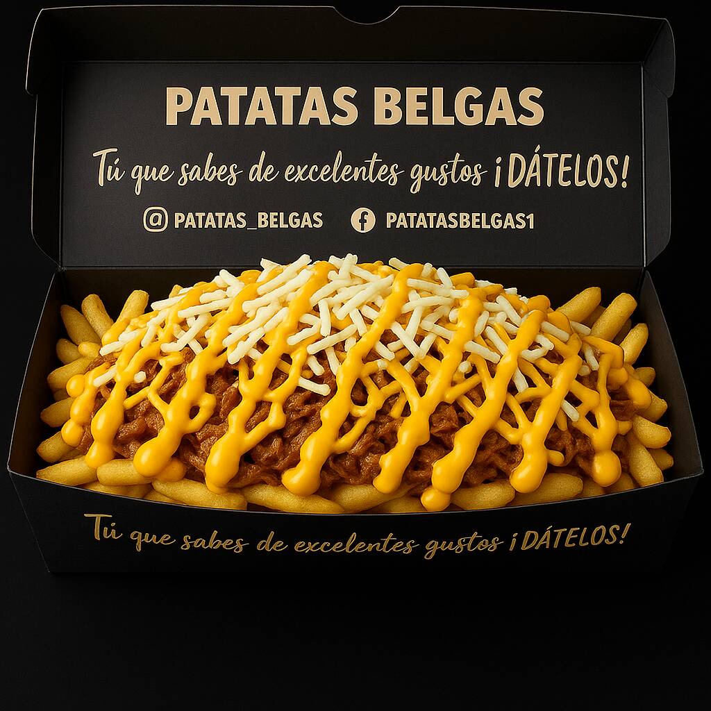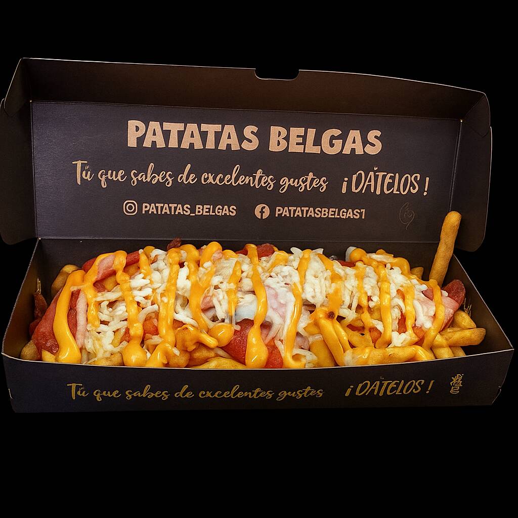 Patatas fritas al estilo belga, queso, huevos de codorniz, chicharrón, guacamole, maduro en trozos, chorizo, tocineta, maíz tierno y cheddar.