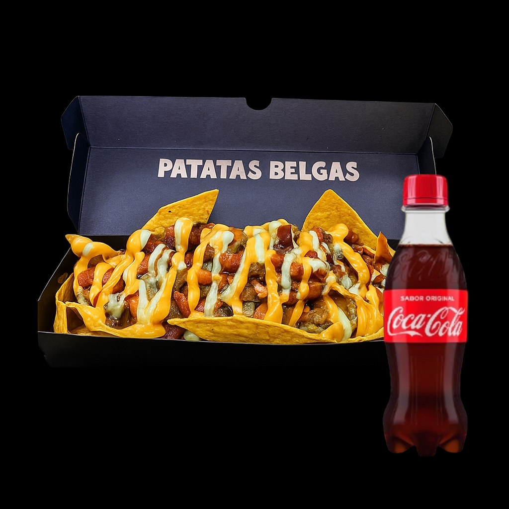 Salchipapas mexicanas, patatas fritas al estilo belga, queso fundido, huevo de codorniz, guacamole, carne molida, frijol refrito, pico de gallo, sour cream, chicharrón, nachos con cheddar y Coca Cola personal.