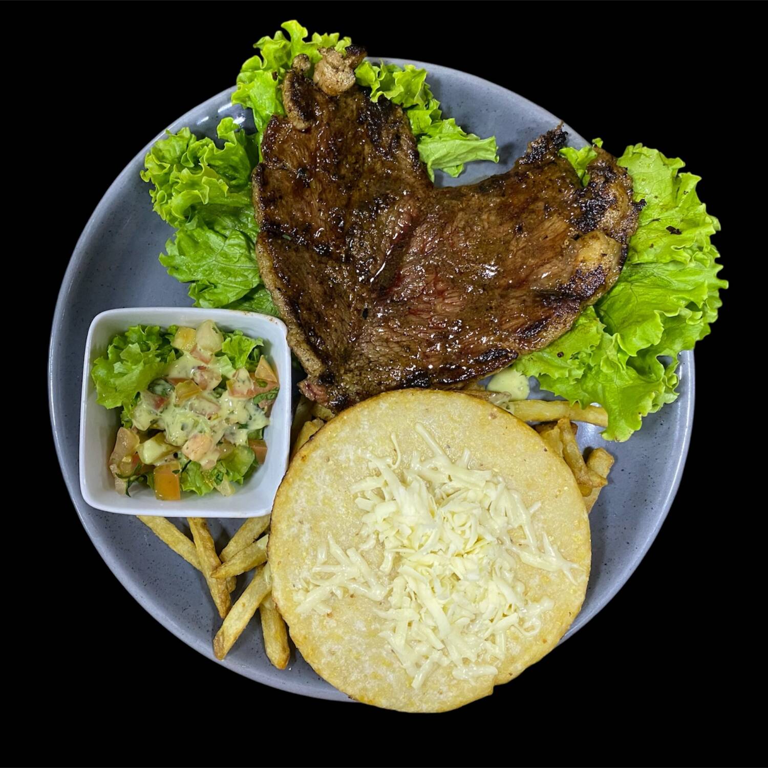 Punta de anca al término que desees, acompañada de patatas fritas al estilo belga, arepas con queso, ensalada verde y salsas de la casa al gusto.