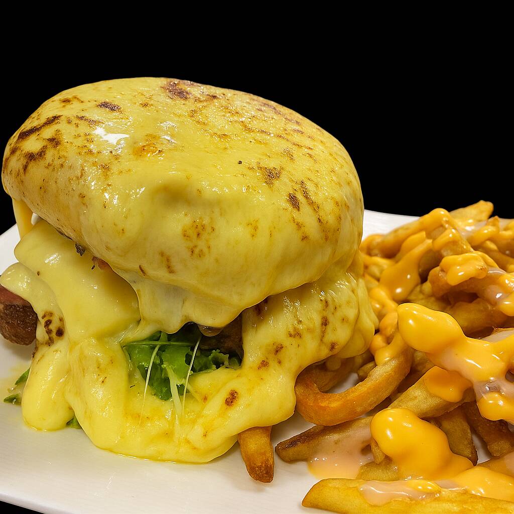 Burger cubierta en queso flameado, pan artesanal, doble carne preparada por el chef, queso fundido, cheddar fundido, pepinillos, tocineta y salsa de la casa. Acompañado de patatas fritas al estilo belga.