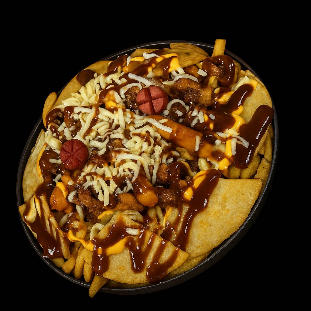 Patatas fritas al estilo belga, queso fundido, huevo de codorniz, salchicha, chorizo, rosetas de pollo crujiente, maíz tierno, pico de gallo y salsas de la casa.