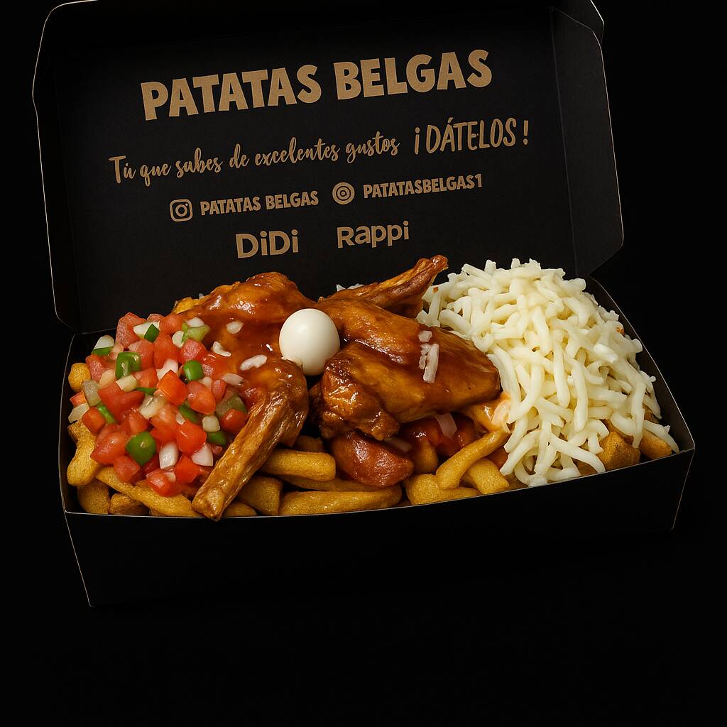 Patatas fritas al estilo belga, carne de cerdo desmechada a la barbacoa, queso, huevos de codorniz, salchicha ranchera, maíz tierno, tocineta, ripio de papas y salsas de la casa.