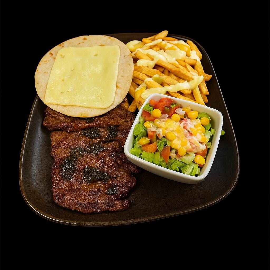 Carne de res asada, acompañada de patatas fritas al estilo belga, ensalada, arepa con queso y salsas de la casa al gusto.