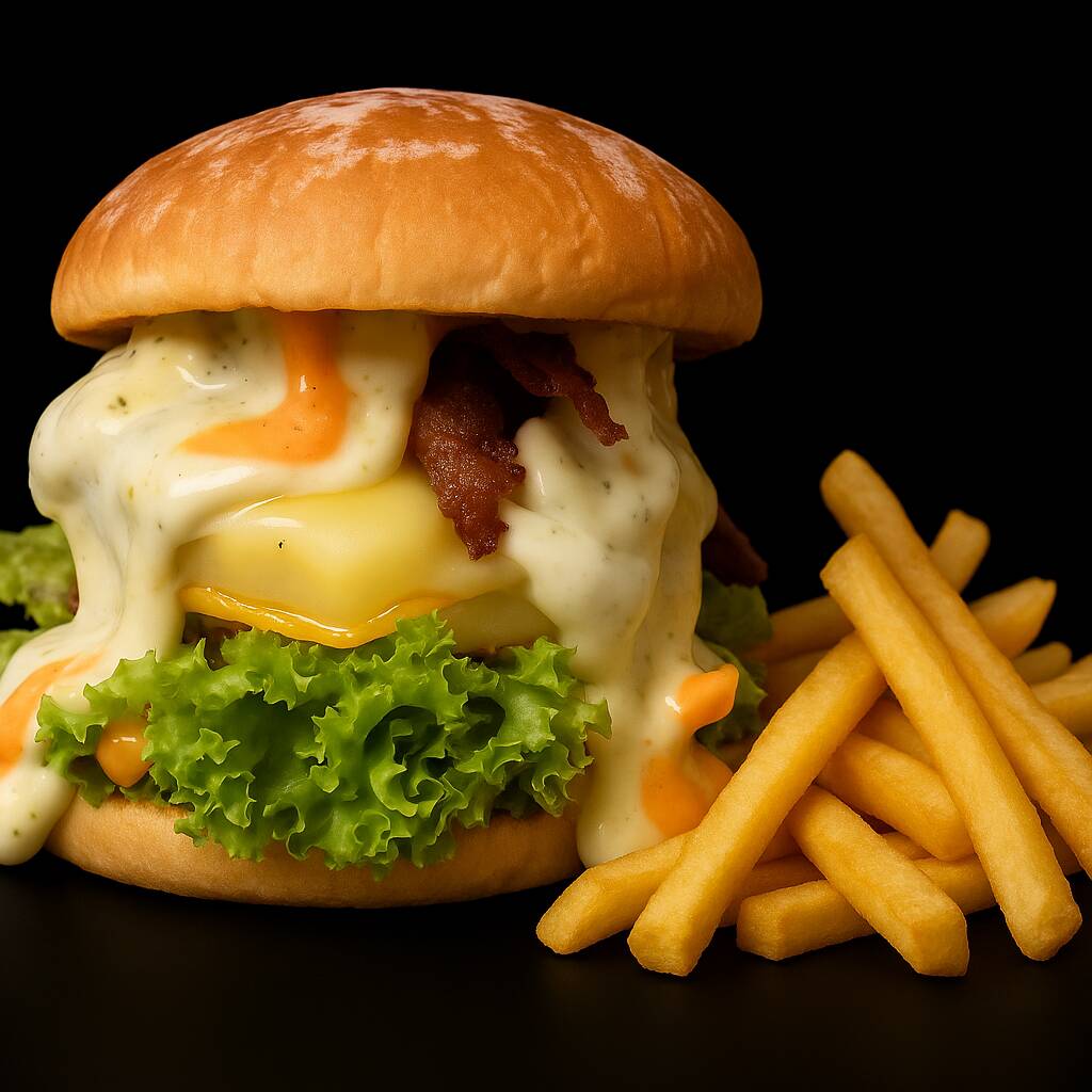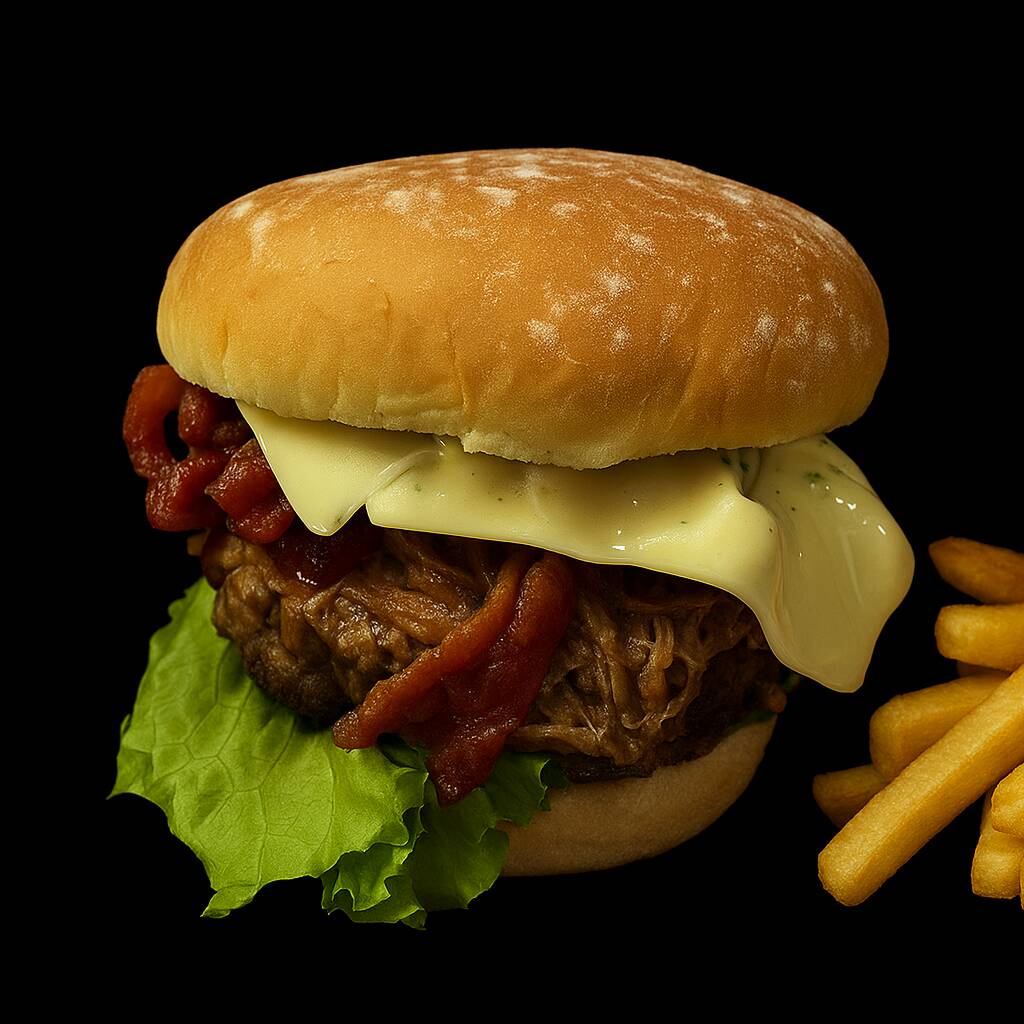 Pan artesanal, carne preparada por el chef, queso fundido, queso holandés, lechuga, pepinillos, cebolla, tomate, tocineta, salsa de la casa y queso fundido cheddar. Acompañado de patatas fritas al estilo belga.
