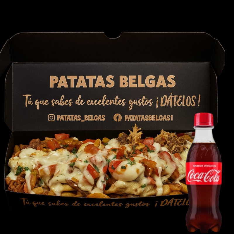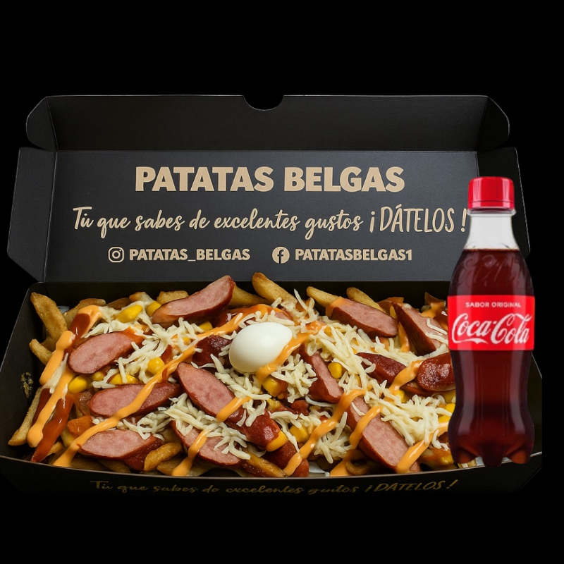 Platillo personal (aprox. 600 g): Salchipapas americanas con patatas fritas al estilo belga, cheddar fundido, huevos de codorniz, salchicha, tocineta con queso mozzarella y Coca-Cola personal.