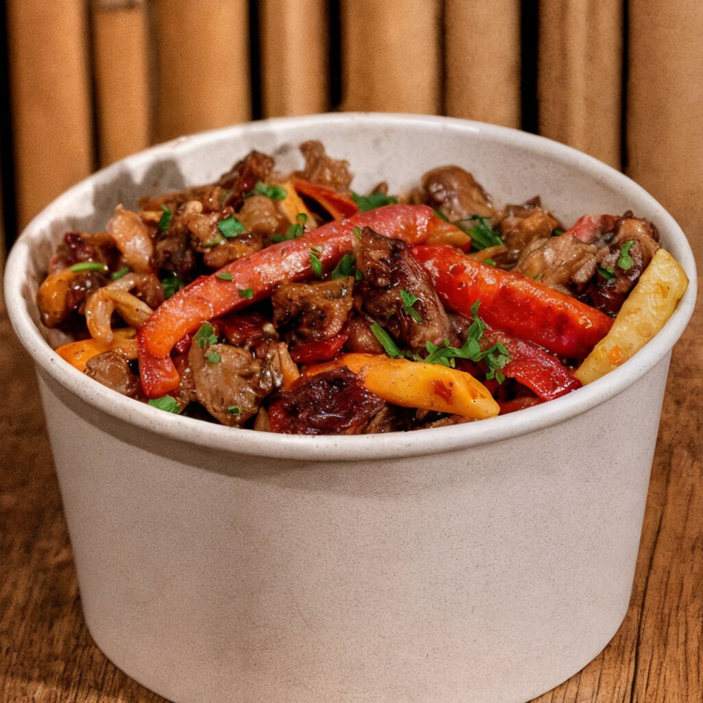 Patatas crujientes a la francesa cubiertas con solomo salteado en reducción de salsa de soya y teriyaki, acompañadas de cebolla y tomate fresco en julianas. Servias con salsa de la casa, salsa BBQ y coronadas con un toque fresco de perejil.