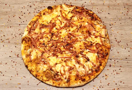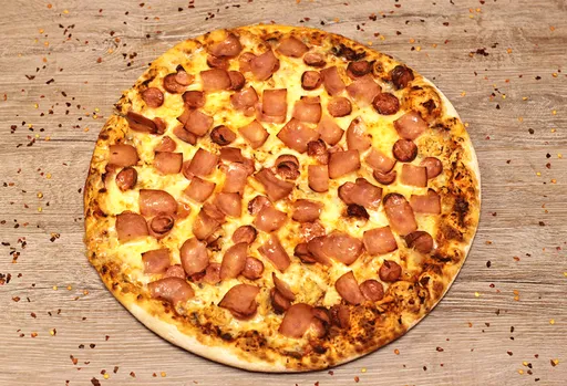 Pollo, jamón, cabano, pimentón, cebolla, champiñones y queso.