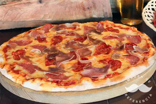 Chorizo italiano, jamón serrano, queso mozzarella y queso amarillo.