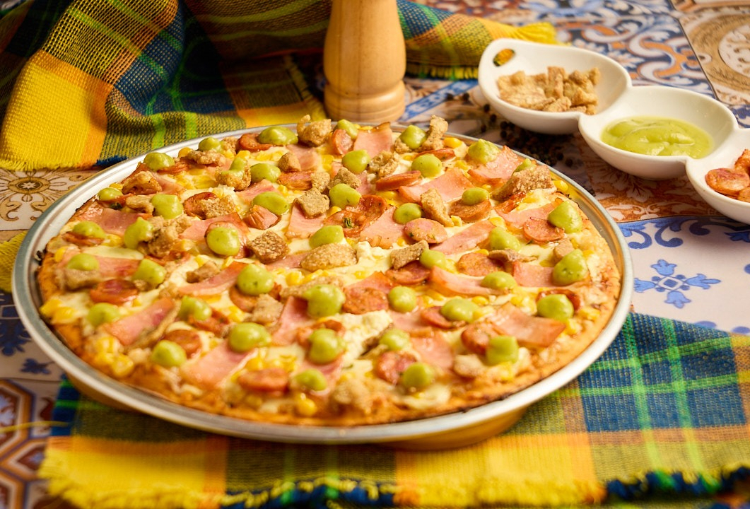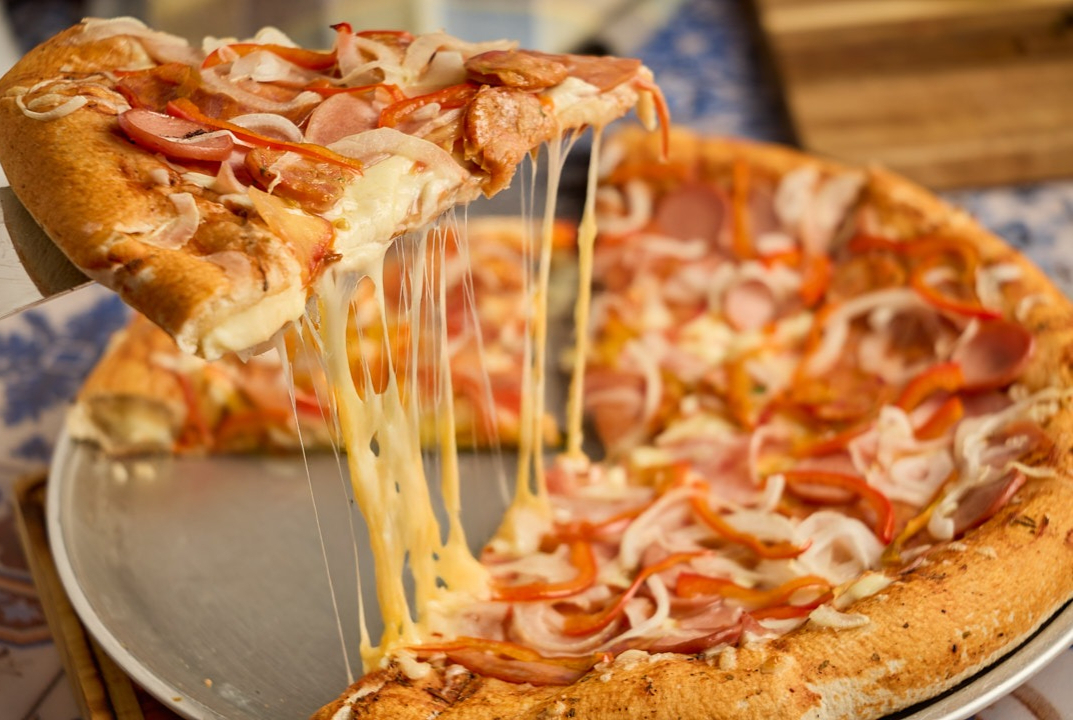 Deliciosa pizza jamón & queso de 12 de porciones hecha con masa artesanal.