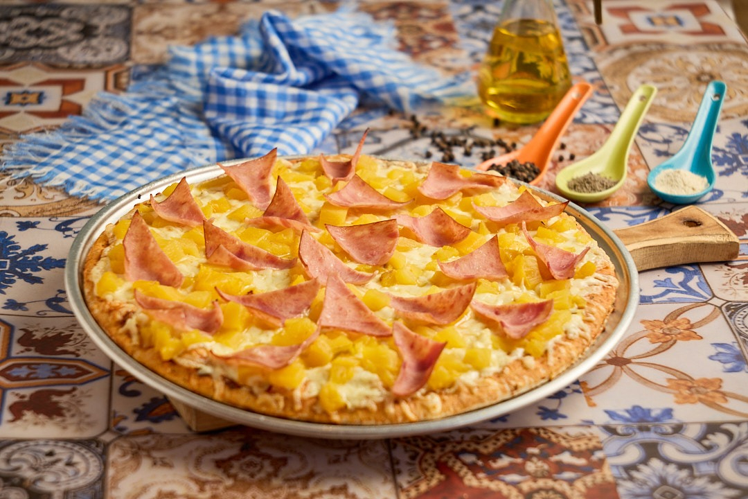 Deliciosa pizza hawaiana de 12 de porciones hecha con masa artesanal.