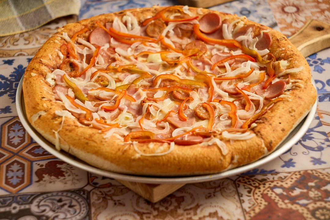 Jamón, salami, ranchera, chorizo, cábano, pepperoni, tomate, cebolla y pimentón.