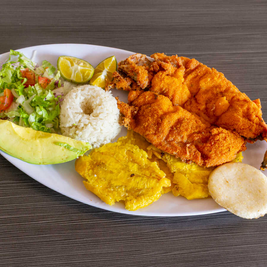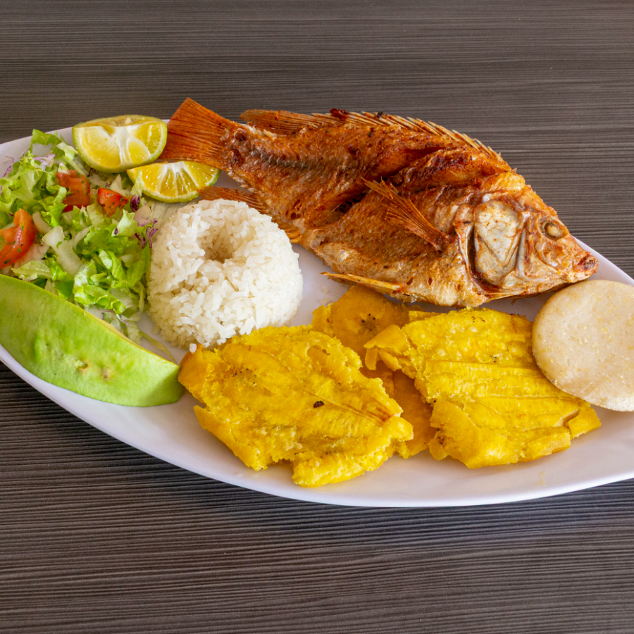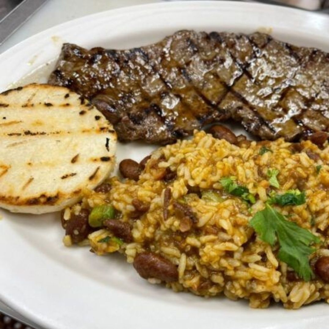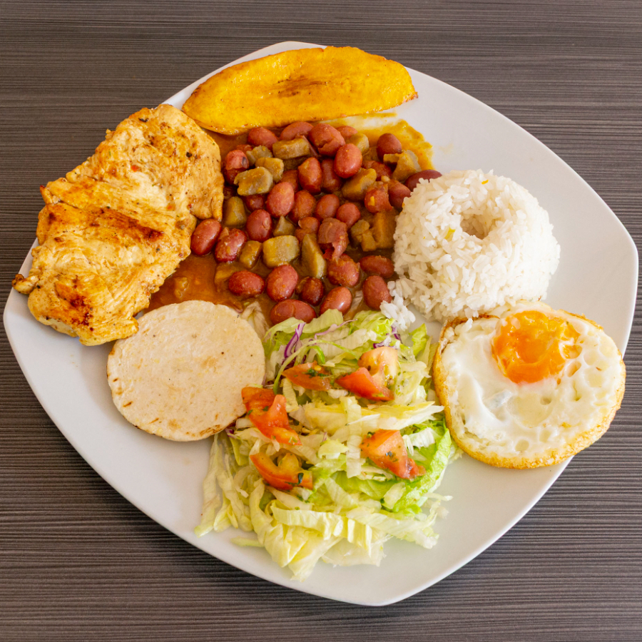 Arroz, frijol, proteína de 100 g de su elección, huevo frito, tajada de maduto, ensalada, arepa, sopa del día y bebida vaso de 9 onzas.