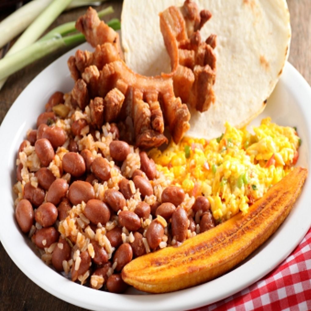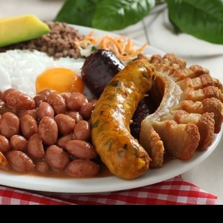 Arroz, frijol, ensalada, chicharrón 100 g, chorizo, morcilla, molida, huevo frito, aguacate, tajada de maduro, arepa y bebida vaso de 9 onzas. Platillo personal.