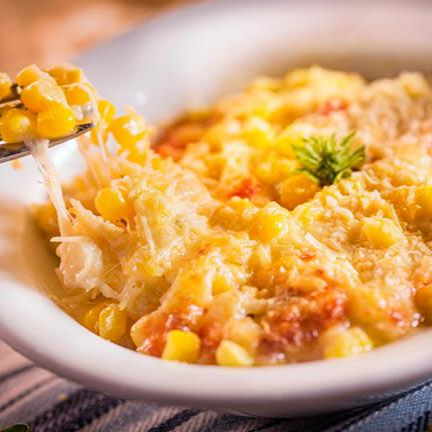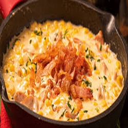 Trozos de tocineta horneados en salsa blanca y queso cheddar gratinados con maíz tierno.