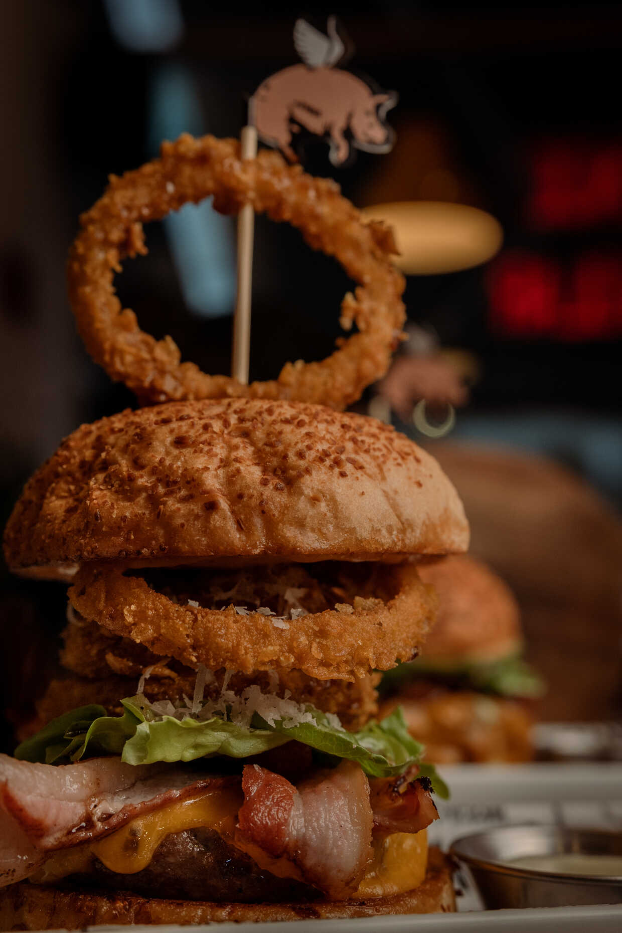 Proteína vegetal a base de plantas a la parrilla, pan artesanal de parmesano, queso cheddar, queso philadelphia, cogollo europeo, cebolla grilled, salsa chipotle y en la corona un aro de cebolla tempura.