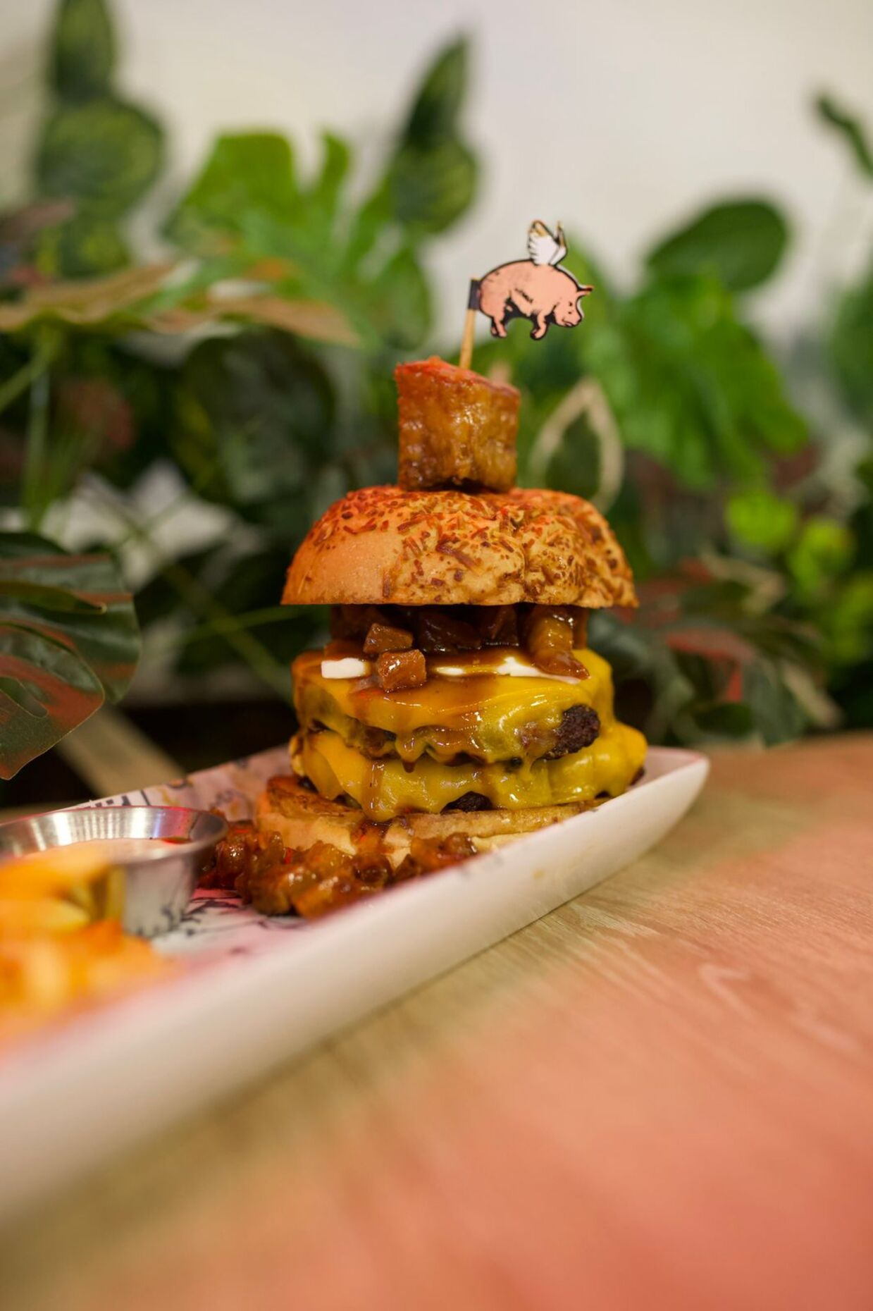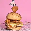 Pan artesanal de parmesano, carne de 166 g, una big alita de cerdo 200 g aprox, bañada en BBQ y parrillada, 4 quesos cheddar, salsa chipotle y en el tope el espectacular chicharrón bañado en chile dulce. Acompañado de papas a elección.