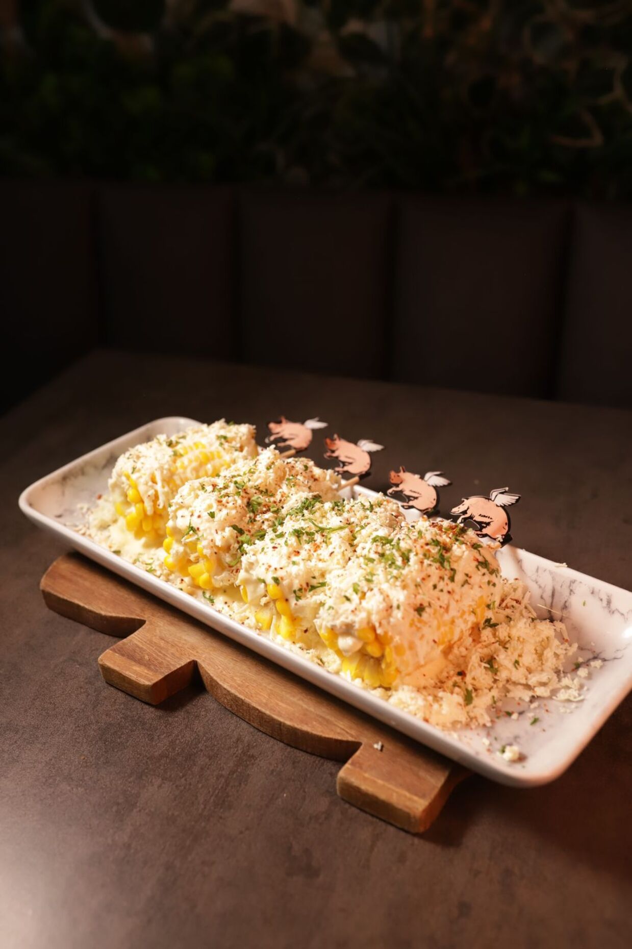 2 Deliciosas mazorcas, maíz desgranado, crujiente chicharrón, bañados en salsa de crema agria, queso costeño y tajín.